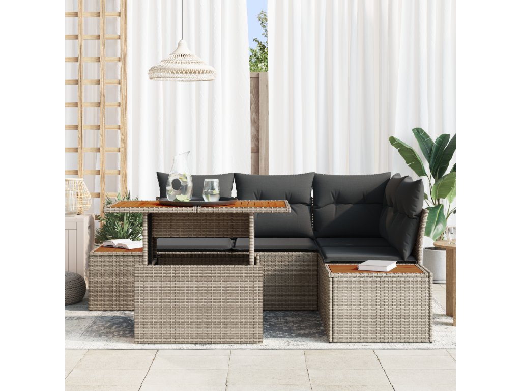 Špičkové materiály: Je vyrobený z polyratanu, práškově lakované oceli a masivního akáciového dřeva, takže je připravený na venkovní použití. Tyhle materiály dodávají super pevnost a pěkný vzhled, což zajistí dlouhou životnost. Co je součástí: Set věrně obsahuje dvě boční sofa, rohové křeslo, středové křeslo a zahradní stůl. Každý kus má úložný prostor, což je praktické. Super funkce: S nastavitelnou výškou stolu a modulárním designem si to můžeš nastavit podle sebe. Čtvercové opěrky na ruce a úhledný zadní díl ti zaručují pohodlí a hezký vzhled. Nejlepší pro: Ideální do zahrad a na terasy, tenhle flexibilní set se hodí pro setkání nebo prostě pro chillování. UV-odolné materiály chrání před slunečním poškozením. Jak to udržet v dobrém stavu: Aby set vypadal pořád skvěle, používej kryt, když ho nepoužíváš, a přinášej polštáře dovnitř, když se počasí zhorší. Tato snadná údržba ti zajistí funkčnost a krásu na dlouho.- Barva: Šedá a hnědá