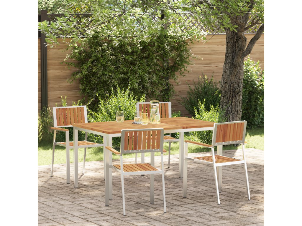 - Rám z nerezové oceli: Tento zahradní jídelní set má pevný rám z nerezové oceli, což zajišťuje stabilitu a odolnost venku. Materiál zvládá vlhké podmínky, takže je to váš spolehlivý parťák pro venkovní jídla. Nerezová ocel vypadá skvěle a zároveň je funkční a stylová.