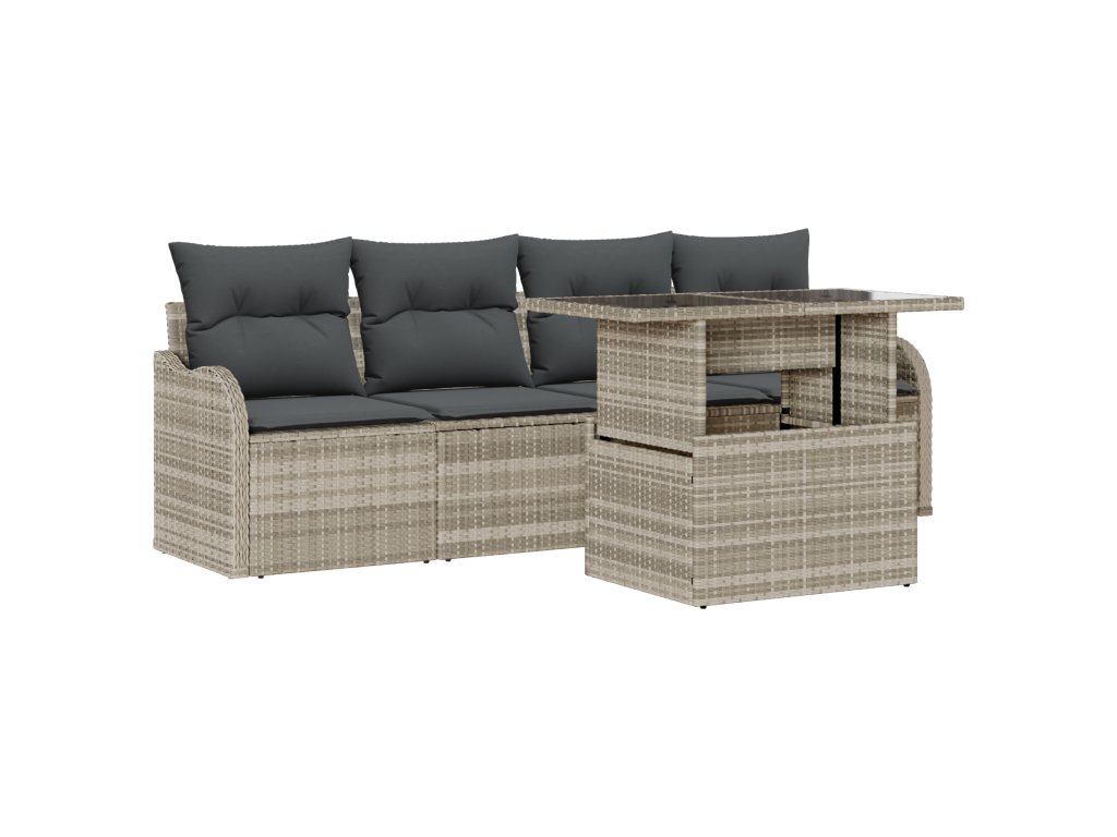 Poly ratanová konstrukce Pohovka je z kvalitního poly ratanu, odolného vůči vyblednutí a skvrnám. Zůstane žhavou součástí každého venkovního prostoru po dlouhá léta. Součásti v ceně Tento set obsahuje dvě středové sedačky, dvě pohovky s opěradly a stůl se skleněnou deskou, což zajišťuje všechno potřebné pro kompletní venkovní posezení. Venkovní polštáře přispívají k pohodlnému lenošení. Funkční prvky Díky výškově nastavitelné stolové desce snadno proměníte stůl z konferenčního na jídelní. Voděodolný úložný vak poskytuje praktické a bezpečné uložení věcí. Univerzální použití Ideální pro jakoukoli zahradu nebo terasu, modulární design umožňuje volné přeuspořádání komponentů, což je super pro různé příležitosti. Její lehká konstrukce usnadňuje přesouvání venku. Jednoduchá údržba Udržovat tuhle nábytkovou sadu v top stavu je jednoduché. Stačí ji zakrýt, když ji zrovna nepoužíváte. Díky snadné údržbě zůstane stále atraktivní a funkční během sezónních změn.- Barva: Světle šedá