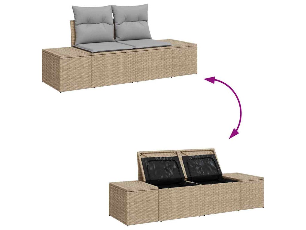 - Víceúčelové venkovní použití: Navržený pro venkovní zábavu, set odolává UV záření a vlhkosti, takže si udržuje svou kvalitu na slunci a v různých podmínkách. Skvělý na terasy, do zahrad nebo k bazénům, poskytuje variabilní řešení sezení pro každé venkovní prostředí. Integrované úložné prostory udržují polstry a doplňky v pořádku.