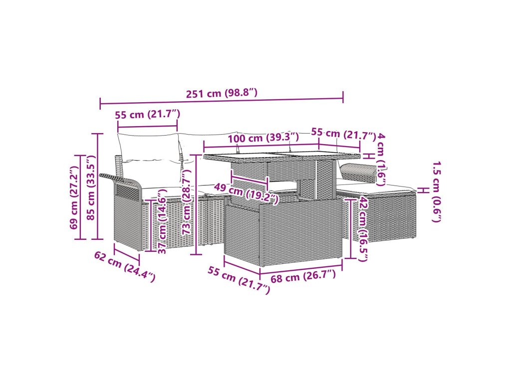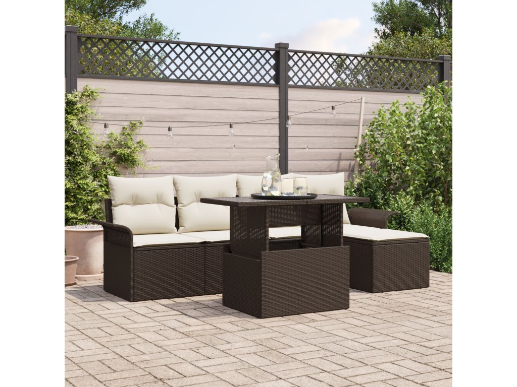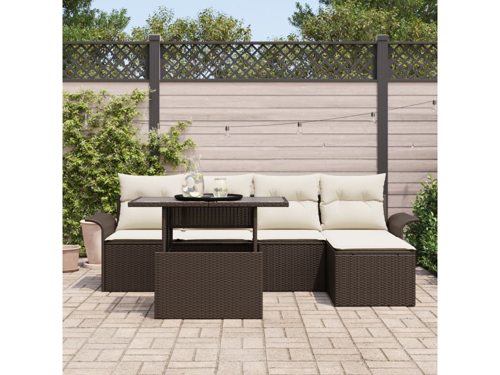 Odolné materiály Vyrobeno z pevného poly ratanu a akáciového dřeva, souprava nabízí styl a odolnost. Poly ratan vydrží počasí a UV záření, takže vypadá skvěle sezónu co sezónu, zatímco akáciové dřevo přidává stabilitu. Zahrnuté komponenty Tato souprava zahrnuje pohodlné sedací podložky a polštáře a poly ratanové zázemí pro elegantní vzhled. Každý detail je navržen tak, aby vylepšil tvůj zážitek a spojil praktickou funkci s moderním stylem. Funkční design Výškově nastavitelný stůl se snadno mění z úrovně kávového stolku na jídelní stůl, přizpůsobuje se tvým potřebám. Lehká, ale robustní konstrukce umožňuje snadné přeskupení pro různé příležitosti. Doporučené použití Tato souprava je ideální pro zahrady nebo terasy, skvělá pro shromáždění i relaxaci. Přináší hvězdný prostor pro sociální akce nebo klidné chvíle s přírodou. Jednoduchá údržba Chcete-li udržet soupravu jako novou, používej kryt, když ji nepotřebuješ. Sestavení je jednoduché, stačí dvě osoby a šroubovák, což ti šetří čas na užívání.- Barva: Hnědá