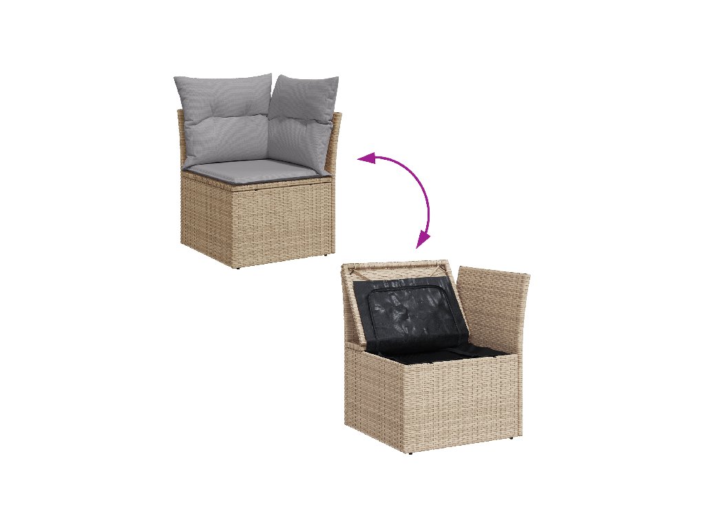 Poly ratanová konstrukce Souprava je z kvalitního poly ratanu, který je odolný a má dlouhou životnost. I při slunečním záření a proměnlivém počasí si udrží skvělý vzhled. Dokončený design zadní strany Tohle zadní provedení vypadá skvěle odkudkoli, takže ji můžete umístit kamkoliv v zahradě nebo na terase. Zajišťuje, že sezení vypadá hezky z každého úhlu. Rám z práškově lakované oceli Tento rám je navržen z práškově lakované oceli, což zajišťuje stabilitu a odolnost. Chráněný povrch je ideální pro venkovní užívání bez časté údržby. Zakřivené opěrky rukou pro pohodlí Díky jemně zakřiveným opěrkám je tato souprava hrozně pohodlná. Poskytuje skvělou oporu pro ruce, ideální na odpočinek nebo příjemné rozhovory. Úplná úložná možnost Integrované úložné prostory vám umožní schovat venkovní potřeby. Udržují polštáře a nářadí skryté, a přitom snadno přístupné, což dělá život venku organizovanější a stylovější.- Barva: Černá