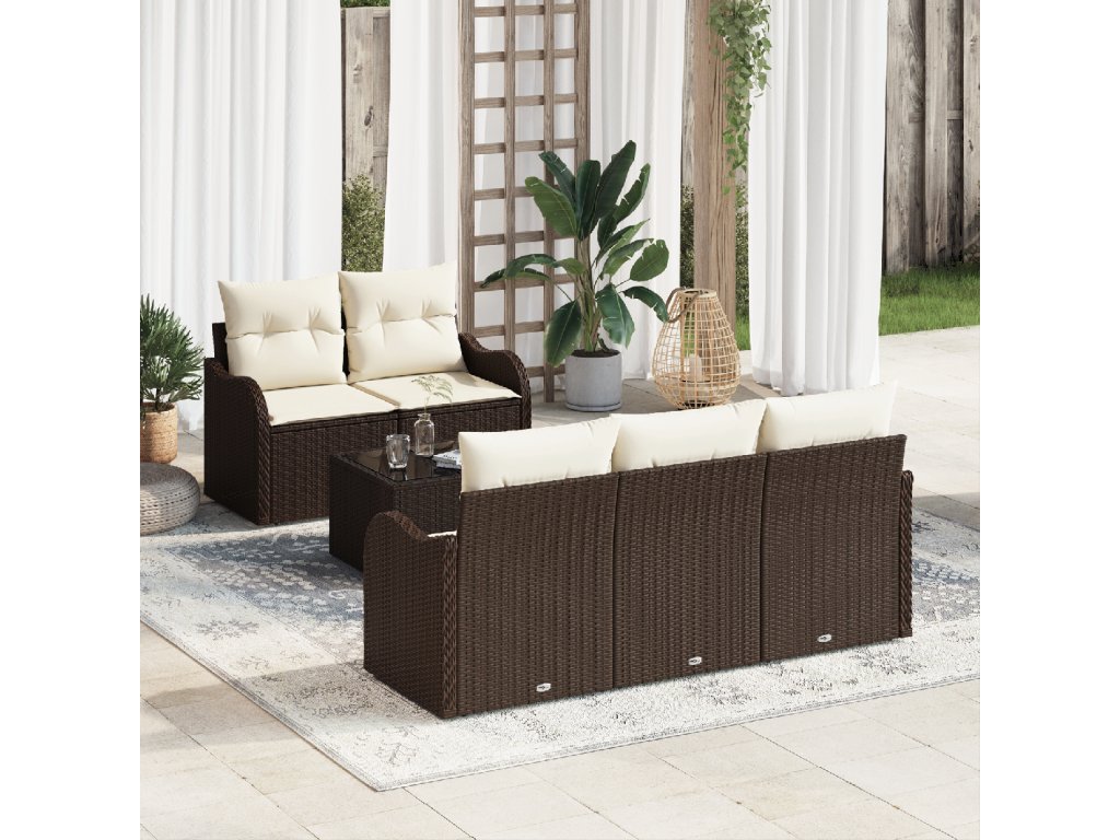 Materiály: Tento set je převážně z poly ratanu, což je materiál odolný a vizuálně hezký. Je pohodlný, pevný a odolný proti povětrnostním vlivům. Polyesterové vlákno zajistí příjemný pocit a chrání před vlhkostí a UV zářením. Ocelové nohy zajišťují stabilitu a dlouhou životnost. Zahrnuté komponenty: Souprava obsahuje střední sedadlo, čtyři pohovky s opěrkami a robustní stůl. Skleněná deska stolu přidává elegantní a trvanlivý povrch pro nápoje a dekorace. Křivky a opěrky z poly ratanu zvyšují pohodlí pro dlouhé posezení. Ocelové nohy garantují pevnou oporu na jakémkoliv povrchu. Funkce/design: Díky modulárnímu designu můžete přizpůsobit uspořádání sedadel podle vašich potřeb. Lehká konstrukce umožňuje snadnou manipulaci a přetváření, takže se snadno přizpůsobí změnám v zahradě. UV-odolné materiály chrání před slunečním zářením, což zajišťuje dlouhou životnost. Doporučeno pro: Ideální pro slunné terasy, zahrady nebo venkovní kouty, umožňuje užít si pohodlné posezení venku. Díky modulárnímu designu podporuje různá uspořádání, ať už jde o malé sezení nebo velké akce. Ať už plánujete letní brunch nebo si chcete jen přečíst knihu, tento set se stane centrem vaší venkovní oázy. Péče a údržba: Udržujte soupravu v dobrém stavu jednoduše otřením vlhkým hadříkem a používáním ochranných obalů, když se nepoužívá. Pro delší životnost uchovávejte polštáře v suchu. Tyto jednoduché úkony zajistí, že váš set zůstane atraktivní s minimálním úsilím.- Barva: Hnědá