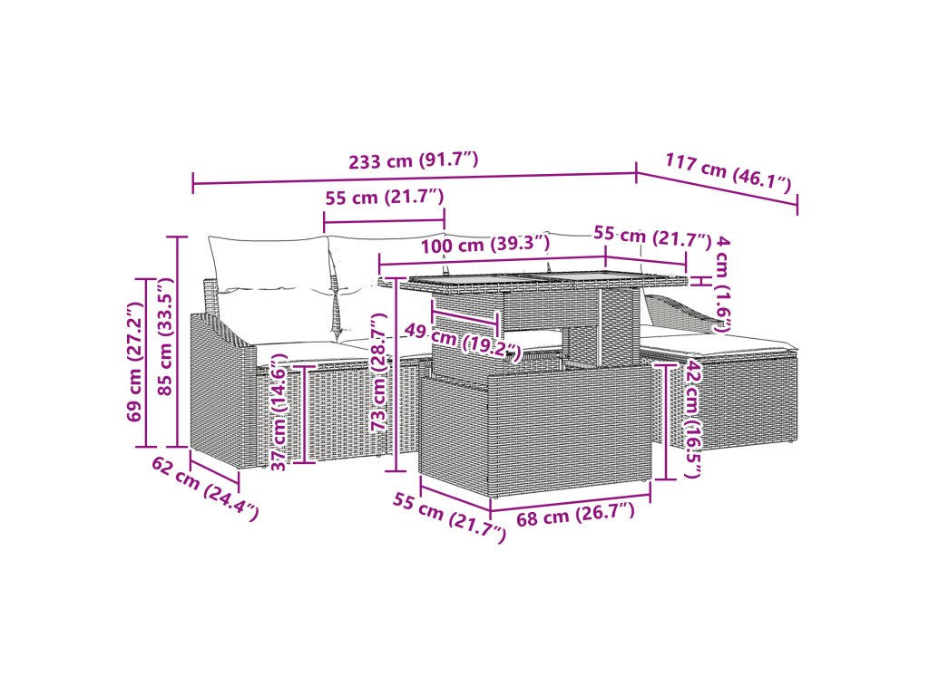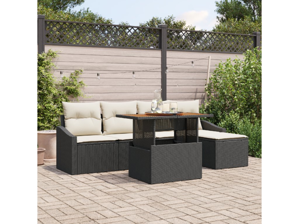 Údržba: Sada vyžaduje minimální údržbu. Aby se ochránila její životnost, používejte ochranný kryt, když se zrovna nepoužívá. Tento jednoduchý krok udrží váš nábytek déle jako nový a zachová jeho UV-odolnost. Součásti: Sada se skládá ze dvou arm sof, dvou středových sedadel, podnožky se skladovacími schopnostmi a odpovídajícího zahradního stolu. Každý kus je dokončen poly ratanem a doplněn povrchy z akáciového dřeva. Nastavitelnost a univerzálnost: Různé části lze manuálně přizpůsobit. S modulárními sekcemi, které lze přeskupit, si můžete snadno uspořádat venkovní prostor podle svých aktivit a shromáždění. Stylové pohodlí: Sedací polštáře s zipy a polyesterové polštářky zvyšují pohodlí sezení. Ergonomický design sady poskytuje uvolňující chvilky v náruči přírody, zatímco odnímatelné potahy usnadňují údržbu. Funkční design: Opěrky rukou a zadní materiály vyhotovené z poly ratanu dodávají této sadě nadčasový a koherentní vzhled. Robustní ocelový rám zajišťuje stabilitu a spolehlivost každého kusu.”- Barva: Černá a krémová