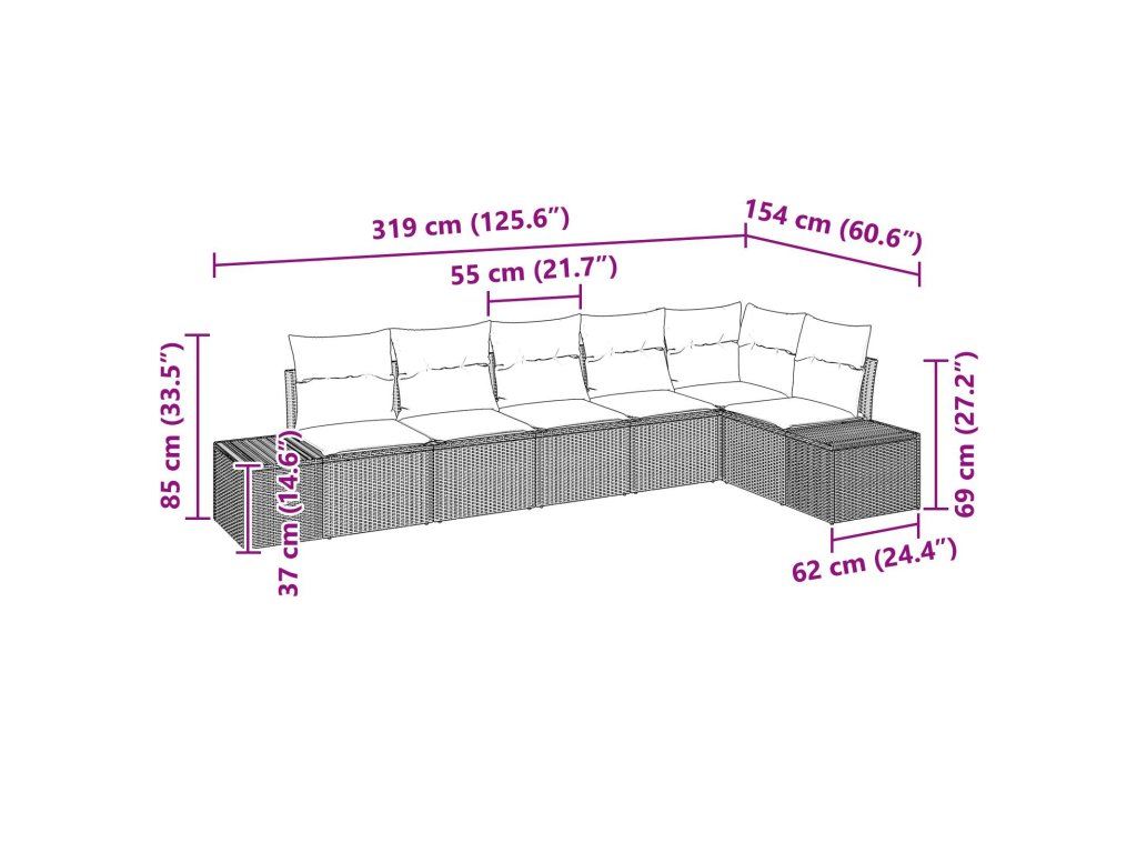 - 2 x boční pohovka: 55 x 55 x 37 cm (D x Š x V)