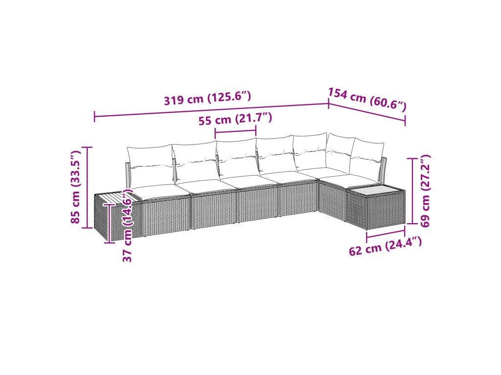- 2 x boční pohovka: 184 x 62 x 69 cm (D x Š x V)