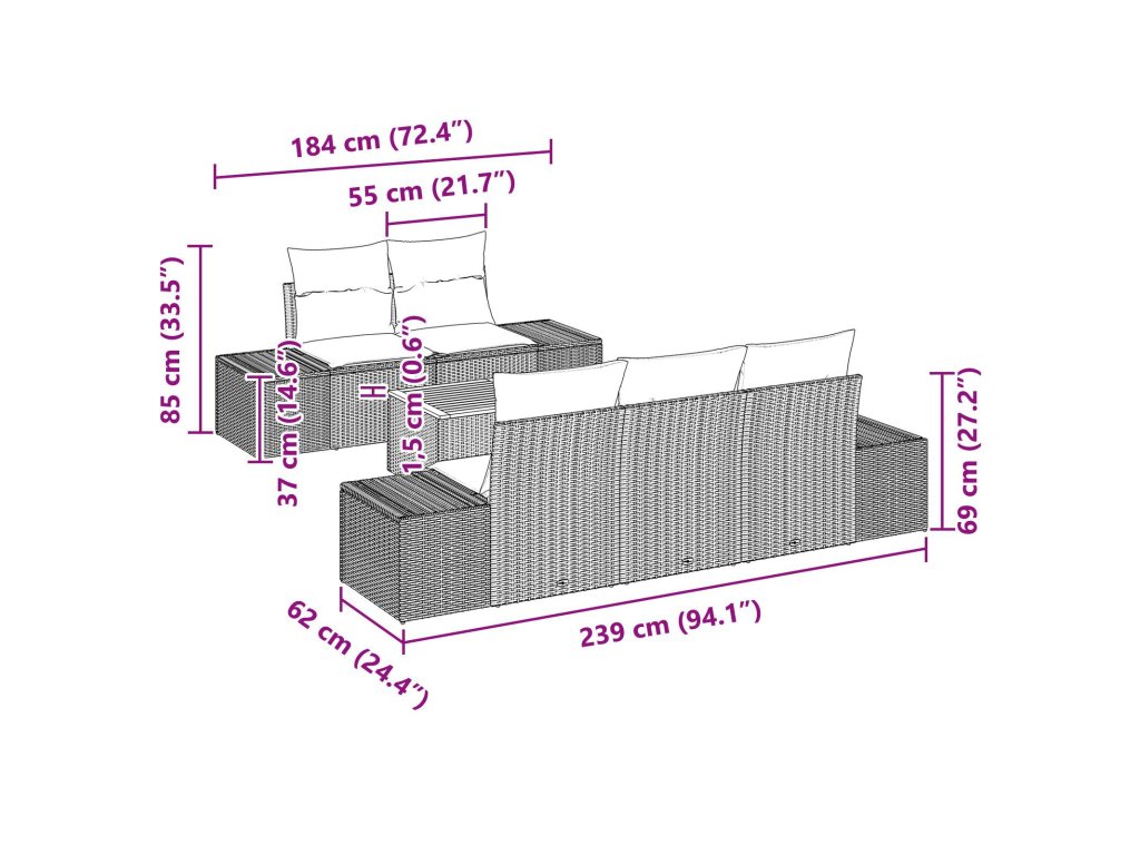 Materiály: Objevte robustní povahu poly ratanu elegantně pleteného do hlavní konstrukce, nabízející dokonalou kombinaci estetiky a síly. Práškově lakovaný ocelový rám poskytuje trvalou podporu a odolává rzi a povětrnostním podmínkám. Odolné polyesterové potahy zvyšují vzhled a komfort. Každý materiál byl vybrán pro své dlouhotrvající vlastnosti, což zajišťuje, že se tento kus stane spolehlivým prvkem ve vašem venkovním prostředí. Součásti: Tento set se pyšní ergonomicky navrženým opěradlem a područkami z poly ratanu, doplněným měkkými polyesterovými polštáři pro luxusní pohodlí při sezení. Uložení zahrnuje centrální sedadlo, čtyři boční sedačky a praktický zahradní stolek, což umožňuje dynamické uspořádání místnosti a optimální společenskou interakci. Vlastnosti / Funkce / Design: Nabízející modulární konstrukci, set lze volně rekonfigurovat tak, aby vyhovoval jakémukoli zvolenému uspořádání sezení. Je zvýrazněn výškově nastavitelnými nohami, které zajišťují stabilitu na nerovných površích. Navíc set disponuje venkovním polštářem s látkami odolnými proti povětrnostním vlivům, které vytrvají za různých podmínek, aniž by obětovaly pohodlí nebo styl. Doporučené použití: Ideální pro zahrady a terasy, protože jeho moderní styl se bez problémů mísí s přírodou. Vysoce univerzální, vhodné pro rodinné setkání nebo osobní chvíle zamyšlení, což z něj činí základ pro různé venkovní aktivity. Péče a údržba: Pro zachování jeho elegantních vlastností přenášejte polštáře během nepříznivého počasí dovnitř a používejte potahy, když se nepoužívá. Jemně utírejte povrchy vlhkým hadříkem, abyste zachovali živý vzhled a užívali si trvalý venkovní zážitek.- Barva: Černá