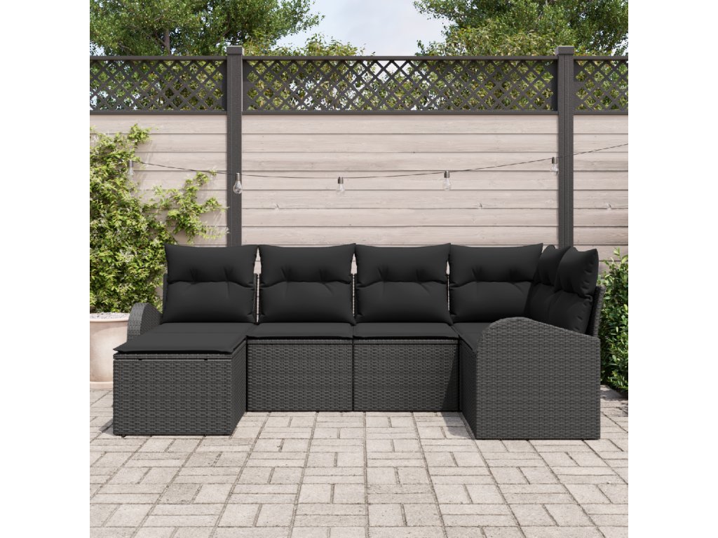 Povrchové materiály: Pohovkový set je převážně z polyratanu, což je odolný materiál vhodný do různých klimatických podmínek, zaručující dlouhou životnost. K tomu je rám z práškově lakované oceli, který poskytuje stabilitu a odolnost ve všech ročních obdobích. Funkční komponenty: Každý díl obsahuje pohodlné sedací podušky s odnímatelným potahem, což usnadňuje údržbu. Opěrky zad a rukou z polyratanu přidávají na ergonomice a pohodlí a zároveň harmonizují s celkovým designem. Víceúčelové funkce: S modulárním designem si set přizpůsobíte podle různých prostorových potřeb. Je také lehký na přemísťování a jeho úložné prostory uvnitř lavic nebo ottomanů pomáhají udržet organizaci a minimalizovat nepořádek. Odolnost vůči venkovním podmínkám: Je navržený tak, aby odolal UV záření a zachoval si svůj vzhled i na slunci. Materiály jsou stabilní proti opotřebení, což umožňuje bezproblémové užívání během jara a léta. Pokyny k údržbě: Správná péče zahrnuje použití ochranného krytu během nepoužívání pro prodloužení životnosti setu. Příležitostné čištění hadříkem udržuje povrchy bez prachu a zajišťuje, že set vypadá stále dobře.- Barva: Černá