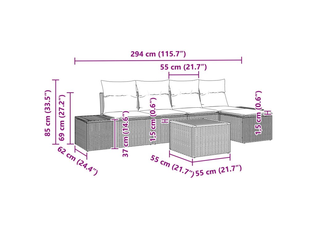Materiál Poly Rattan Navržen pro odolnost, poly rattan je vysoce odolný a odolává venkovním prvkům. Jeho tkaná textura nejen přispívá k modernímu vzhledu, ale je také obzvlášť snadná na údržbu. Tato konstrukce zajišťuje dlouhodobé používání bez ztráty stylu či robustnosti, čímž je skvělou volbou pro zahrady, terasy nebo balkony. Modulární komponenty Znovu uspořádatelný design se snadno přizpůsobí jakémukoli zahradnímu uspořádání. Skládá se z různých prvků, jako jsou středové sedačky, boční pohovky, taburet a stůl, každá komponenta zvyšuje personalizaci, takže se tento set bez námahy vejde do téměř jakékoli venkovní konfigurace. Stabilní podpěra a povrchová úprava Kombinováním ocelového rámu s bezpečným práškovým lakováním set poskytuje neochvějnou podporu. Úprava povrchu zvyšuje odolnost a nabízí hladký, atraktivní povrch, který odolává různým povětrnostním podmínkám bez koroze nebo opotřebení. Pohodlí a ergonomie Vybavený měkkými, venkovními polštáři, set klade důraz na komfort. Tyto polštáře jsou navrženy pro odolnost vůči povětrnostním vlivům, zajišťující pohodlné sezení, zatímco si udržují tvar a barvu i přes sluneční záření nebo nečekaný déšť. Pohodlná údržba a péče Údržba je tak jednoduchá jako otírání povrchů vlhkým hadříkem. Další péče zahrnuje zakrytí nábytku, když není používán, a přenášení polštářů dovnitř během nepříznivého počasí, aby se prodloužila životnost a zachoval vzhled.- Barva: Černá