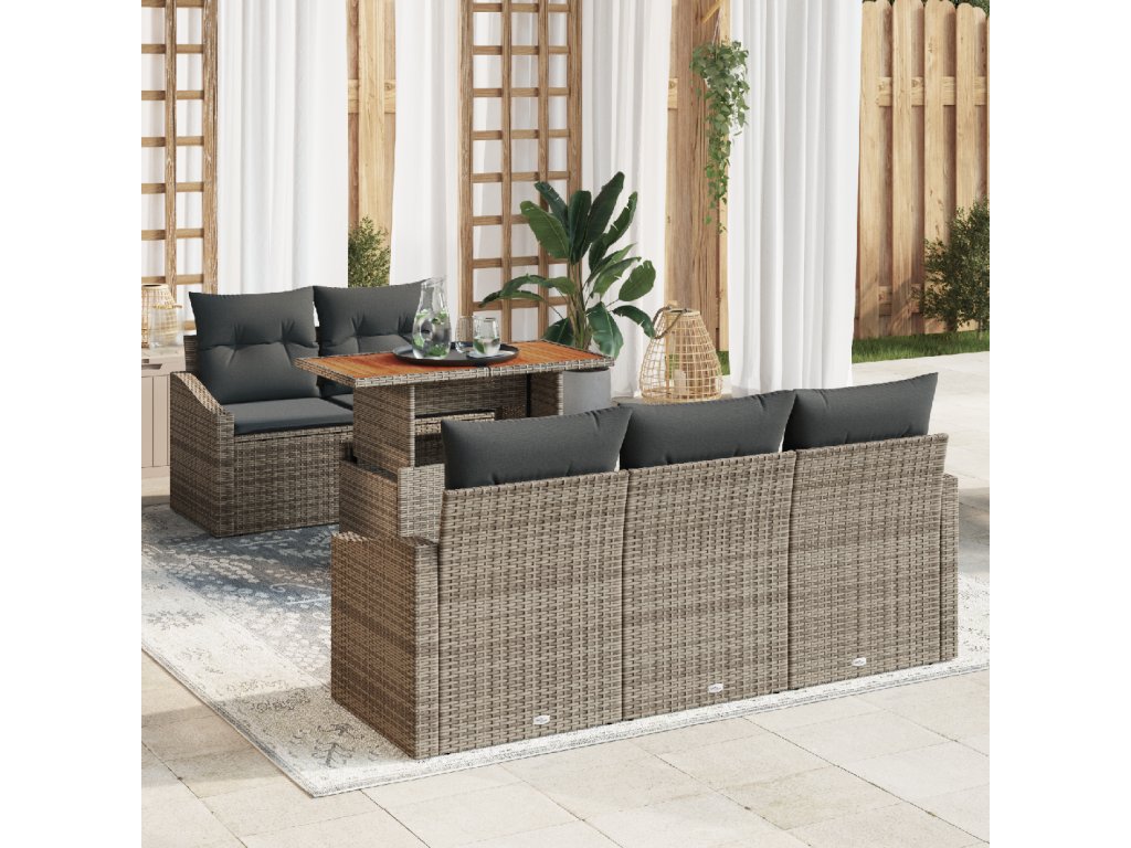 Odolné materiály: Vyrobeno z UV-odolného poly ratanu a odolné práškově lakované oceli, tato sada odolává povětrnostním vlivům. Pevné akáciové dřevěné stolové desky přidávají dotek přirozené elegance a chrání proti deformaci nebo poškození slunečním zářením. To zajišťuje dlouhotrvající používání, takže si můžete s přáteli a rodinou bez obav vychutnávat jídlo i v nečekaném počasí. Ergonomický design: Navrženo pro pohodlí a styl, tato sada zahrnuje měkké polyesterové polštáře a sedadla s pěnovým polstrováním, která podporují uvolněné stravování. S opěrkou a hranatými opěrkami rukou z poly ratanu slibuje zvýšenou relaxaci. Dokončený zadek zajišťuje 360-stupňovou vizuální přitažlivost, což dělá každou útulnou rohovou část působivou. Funkční univerzálnost: Vyjděte vstříc modularitě, která vám umožňuje uspořádat sezení podle jakékoli příležitosti. S nastavitelnými nožičkami zůstává tato jídelní souprava stabilní na nerovných plochách, čímž zvyšuje její použitelnost pro jakýkoli venkovní prostor. Ruční, výškově nastavitelná funkce přivede každou část vaší zahrady na dosah, zosobňuje flexibilitu v designu nábytku. Praktické úložiště: Integrované úložiště v sedacích jednotkách umožňuje bezpečné a suché uskladnění venkovních nezbytností. S polštáři se zipem zajišťujícími snadné odstranění a čištění zůstává váš prostor bez nepořádku. Uložte nesezené dekorativní polštáře nebo mějte venkovní hry dostupné mezi akcemi a optimalizujte funkční prostor. Snadná údržba: Chraňte své jídelní poklady použitím krytu, když se sada nepoužívá, abyste ji ochránili před povětrnostními vlivy. Tato metoda péče udržuje estetiku a prodlužuje trvanlivost materiálů, což dělá váš venkovní útočiště vyhledávaným místem v každé sezóně.- Barva: Šedá a hnědá