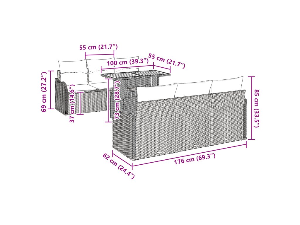 - Součásti: Set se skládá ze čtyř opěrákových pohovek, dvou středových sedadel a jednoho univerzálního zahradního stolu. Každá pohovka má zakřivenou opěrku a stylový design zaměřený na komfort. Odnímatelné polštáře na opěradlech a sedadlech jsou lehce čistitelné, což usnadňuje údržbu a prodlužuje jejich životnost.