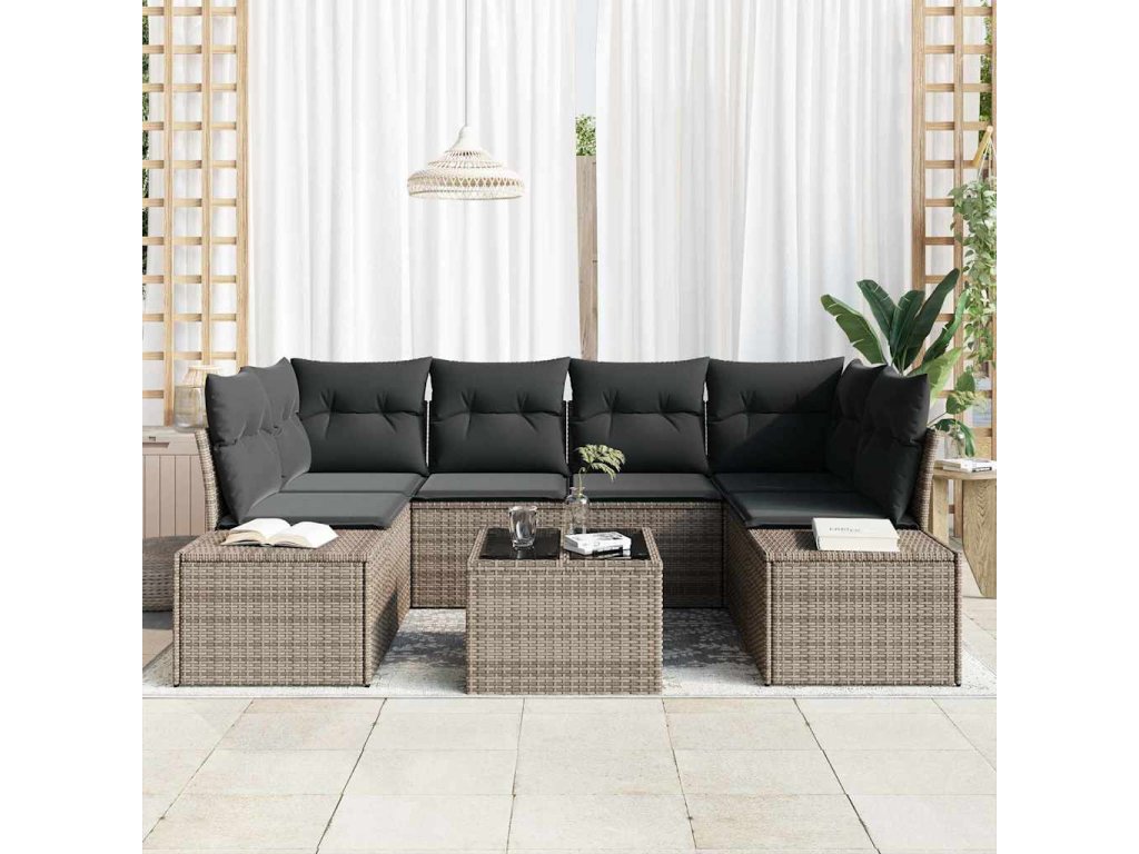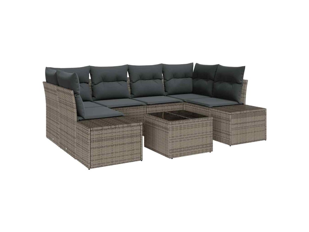 - Odolný rám z polyratanu: Sedací souprava má pevnou konstrukci z polyratanu, která je ideální venku díky odolnosti vůči UV záření a špatnému počasí. Tento materiál zajišťuje, že nábytek si uchová svůj vzhled i funkčnost a je pohodlný díky lehkému polstrování.