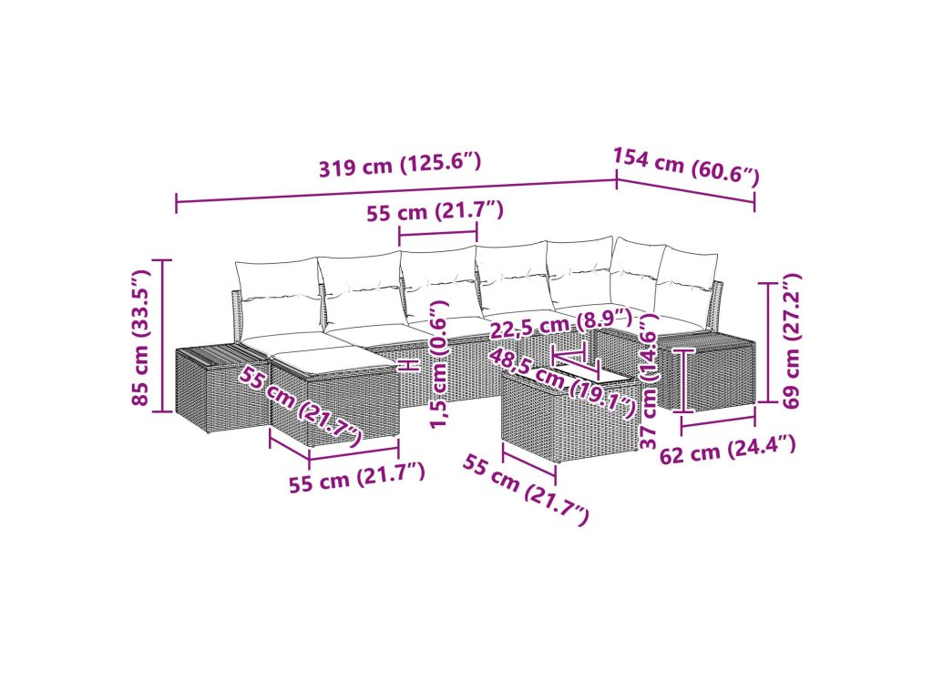 Odolná konstrukce Set je vyrobený z kvalitního poly ratanu, takže ti vydrží a neskolí ho žádné počasí. Stabilní rám z práškově lakované oceli zajistí, že vydrží i na slunci nebo pod pergolou. Snadné použití Měkké polyesterové polštáře dodávají pohodlí a jsou skvélé pro dlouhé venkovní relaxace. Polštáře mají voděodolné potahy, které je chrání před deštěm a sluníčkem, takže si zachovají svůj vzhled léta i léta. Modulární variabilita Tento venkovní gauč se skládá z modulárních sekcí, které si můžeš přizpůsobit jak chceš. Ideální pro grilovačky nebo malé rodinné akce, snadno se přizpůsobí tvým potřebám. Funkční design Set má nivelátory, které ho stabilizují na nerovných plochách, takže je ideální pro trávník nebo na terase. Tato funkce zajišťuje, že si sedění užiješ, i když je terén členitý. Praktické pokyny pro údržbu Navržený pro snadnou údržbu, set si žádá minimální péči. Když ho nepoužíváš, zakryj ho a polštáře přenášej dovnitř při nepřízni počasí, aby vydržely co nejdéle. To zaručuje, že ti set bude sloužit krásně i dlouho potom, co ho poprvé vybalíš.- Barva: Šedá