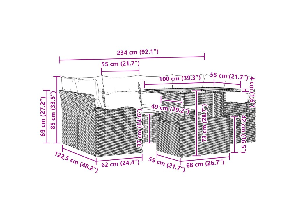 Kvalitní materiály: Tato sada je vyrobená z poly ratanu, práškově lakované oceli a masivního akáciového dřeva, slibuje estetický a robustní design vhodný na venek. Poly ratan si uchovává moderní tkanou texturu a odolává UV paprskům, což zajišťuje dlouhotrvající vzhled a použitelnost. Strukturální integrita je posílena práškově lakovaným ocelovým rámem, který zajišťuje veškerou sílu bez kompromisů ve stylu. Praktické komponenty: Sada obsahuje dvě křesla, pár rohových a centrálních sezení a zahradní stolek - každý kousek spojuje pohodlí a úložný prostor. Tyto komponenty mají venkovní polštáře odolné vůči povětrnostním podmínkám, což zajišťuje pohodlí a dlouhou životnost. Zakřivené opěrky rukou nabízejí ergonomickou podporu, která podporuje relaxaci bez omezení. Design a funkce: Mezi klíčové vlastnosti patří UV-odolná ochrana materiálu, která udržuje živost těchto pohovek při sezonním vystavení. Odnímatelné polštáře zajišťují přizpůsobivost a snadnou údržbu, představují tedy promyšlený design pro různé venkovní prostředí. Všestranné využití: Přizpůsobená pro zahradní a terasové prostředí, tato nábytková sada ztělesňuje všestrannost, ideální pro jarní a letní setkání, neformální lenošení nebo intimní společenské události. Její atraktivní vzhled v kombinaci s praktickou funkčností hravě zapadá do různých venkovních dekoračních témat. Péče a údržba: Udržuj ji v top stavu používáním vodotěsných krytů při nepříznivém počasí. Pravidelně utírej povrch vlhkým hadříkem, abys odstranil nečistoty, a uskladni polštáře uvnitř, když je nepoužíváš, aby ses postaral o jejich dlouhou životnost. Taková péče zajišťuje, že sada zůstane pohodlným venkovním společníkem napříč mnoha sezónami.- Barva: Černá a krémová