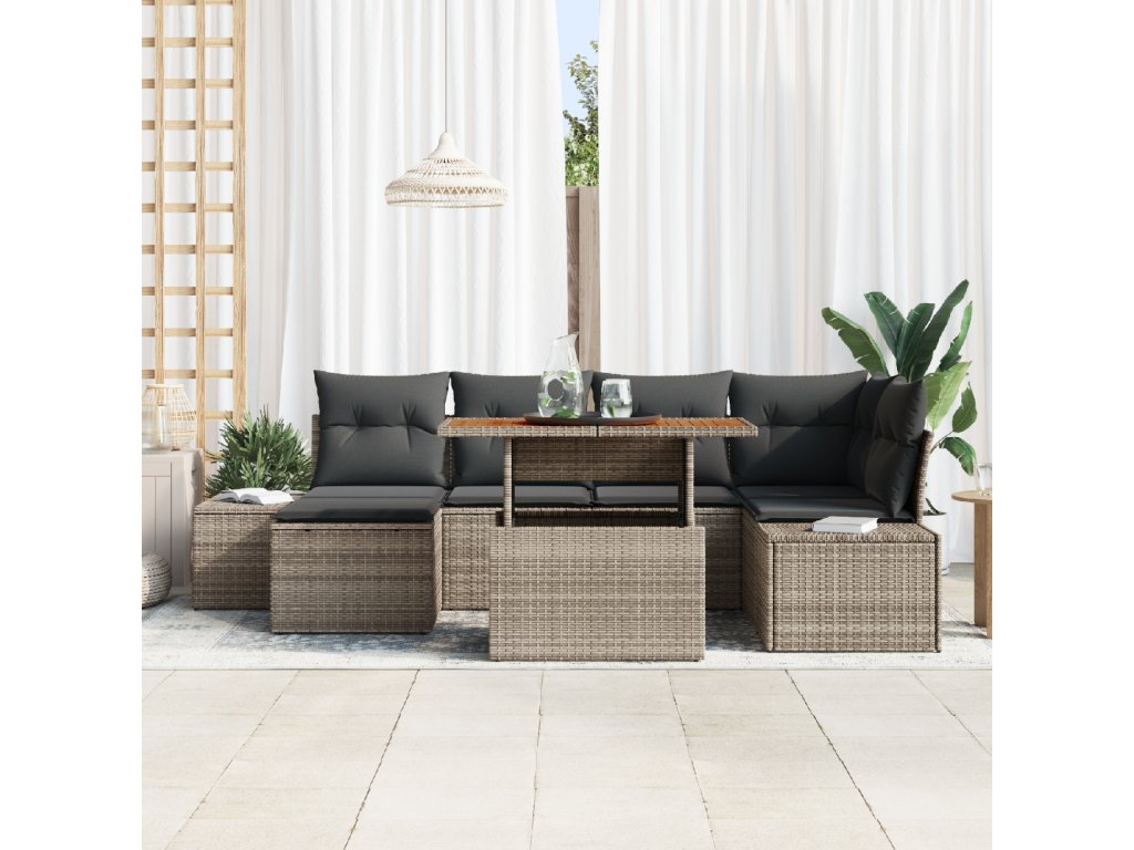 Univerzální modulární design Přetvořte svůj venkovní prostor s touto univerzální jídelní sadou. Každou součást lze uspořádat do různých konfigurací, což umožňuje unikátní nastavení přizpůsobené vašim potřebám. Ať už pořádáte párty nebo si užíváte klidný večer, modularita nabízí nekonečné možnosti. Tato adaptabilita vám zajistí snadnou změnu nastavení, což je ideální pro terasy, zahrady a dvory. Chytré úložné možnosti Přijměte funkčnost s chytrými integrovanými úložnými řešeními. Rohové a boční pohovky spolu s taburetem mají výhodné úložné prostory. Tyto skryté prostory jsou ideální pro ukládání venkovních nezbytností, jako jsou polštáře nebo deky. Tato praktická funkce pomáhá udržovat pořádek a rychle uklidit vaši venkovní oblast, aby bylo vše vždy po ruce. Materiály odolné vůči počasí Sada je vyrobena z odolného poly ratanu odolného vůči UV záření, což zajišťuje, že si zachová svůj půvab a kvalitu po dlouhou dobu. Práškově lakovaný ocelový rám poskytuje dodatečnou stabilitu a odolnost vůči různým povětrnostním podmínkám. Užijte si trvalý zážitek z pohodlí a stylu s kvalitními materiály navrženými tak, aby odolaly nepřízni počasí. Luxusní akáciová deska stolu Zvyšte svůj zážitek z jídla s pevným povrchem z akáciového dřeva, který nabízí bohatý a přírodní vzhled. Jeho robustní povaha jej činí ideálním pro venkovní použití a vyzařuje příjemnou a pohostinnou atmosféru, která doplňuje celou sadu. Tato výjimečně zpracovaná deska stolu nejen zvyšuje estetiku, ale také nabízí praktickou funkčnost. Praktické pokyny k údržbě Abyste zachovali jeho eleganci, používejte ochranný obal, když se zrovna nepoužívá. Tento jednoduchý krok prodlužuje životnost sady tím, že chrání proti přirozenému opotřebení. Kromě toho je údržba jednoduchá, čímž zajistíte, že si nábytek uchová vzhled jako nový s minimálním úsilím.- Barva: Šedá a hnědá