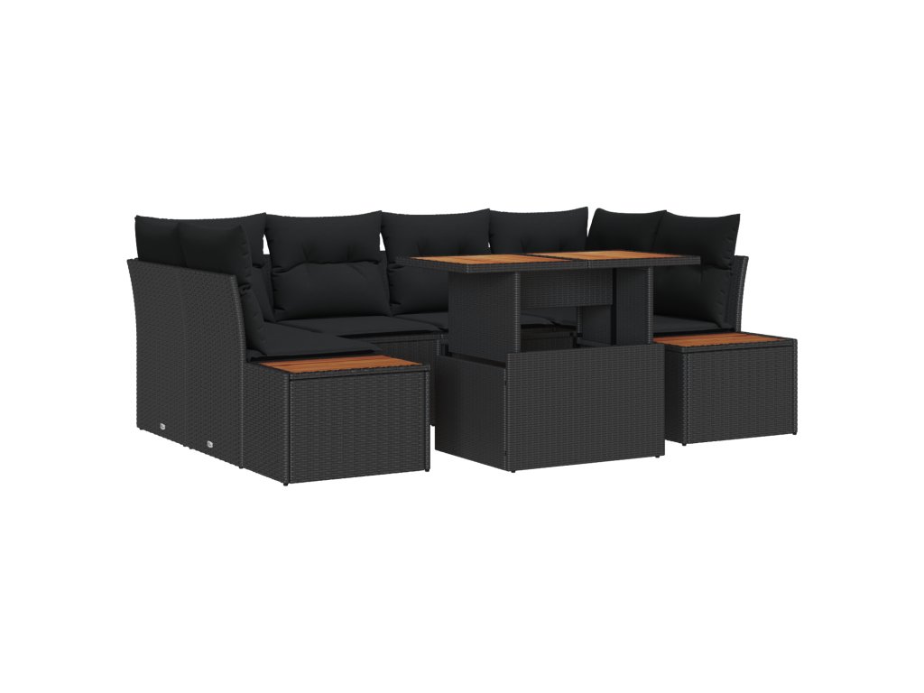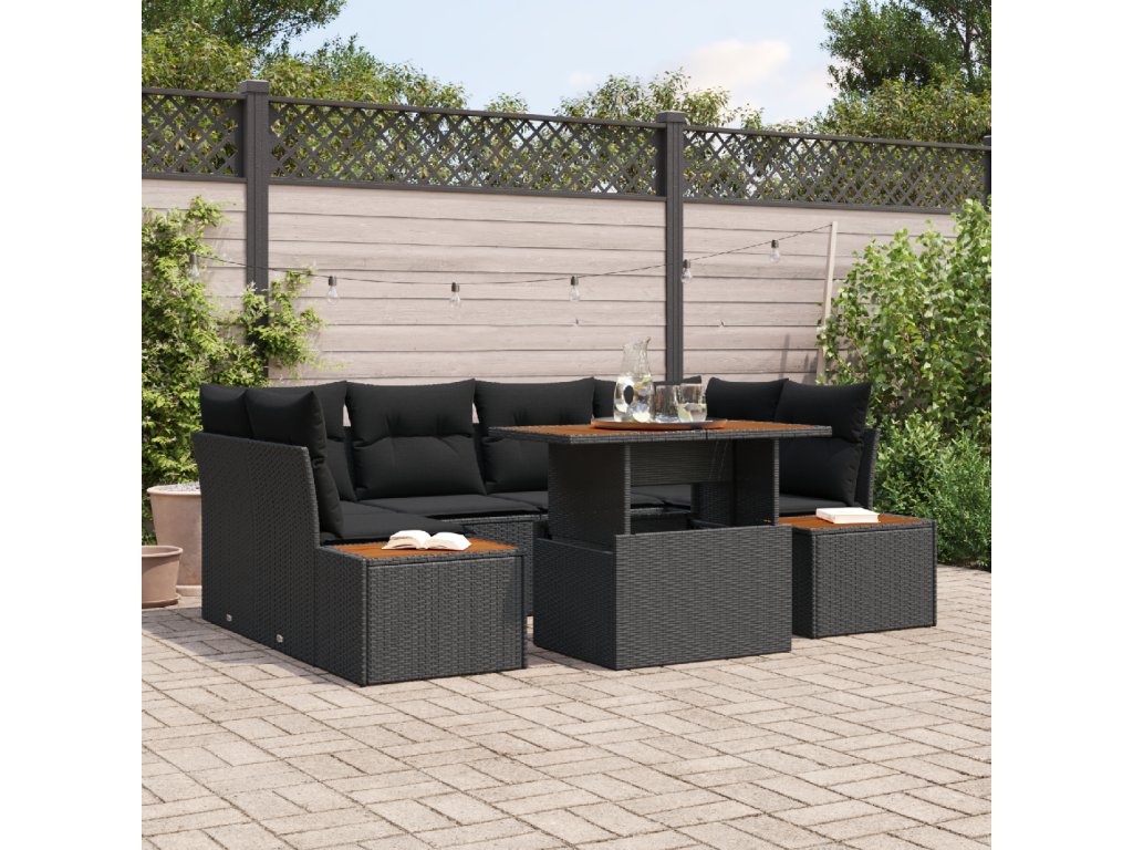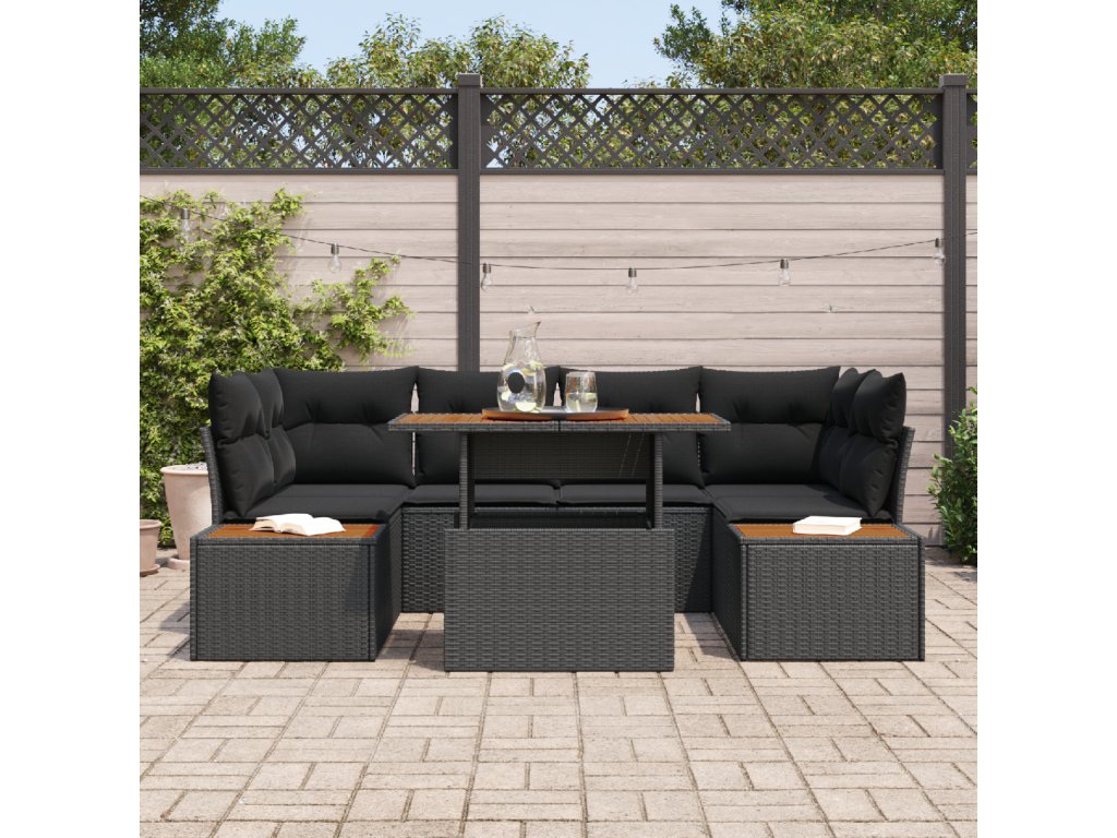 Modulární uspořádání: Tato sada obsahuje všestranné kousky, které lze přizpůsobit tak, aby vyhovovaly vašemu prostoru, což umožňuje optimální uspořádání sezení. Přizpůsobivost je ideální pro měnící se potřeby, takže máte flexibilitu při zábavě nebo neformálních rodinných jídlech. Materiály odolné vůči UV záření: Hlavním materiálem je poly ratan, navržený tak, aby odolával intenzivnímu slunečnímu záření a zachoval si barvu a integritu během sezón. To snižuje nároky na údržbu a poskytuje živou estetiku po celý rok. Pevný akáciový povrch: Povrch stolu se může pochlubit pevným dřevěným materiálem z akácie, známým svou robustností a přirozenou krásou. Tento povrch je ideální pro jídla a setkání, dodává vašemu venkovnímu prostoru nádech luxusu. Funkční úložný prostor: Úložné prostory pod sedadly jídelní sady umožňují snadnou organizaci a udržují potřebnosti blízko, uvolňují prostor pro bezproblémové prostředí. Perfektní pro polštáře nebo jídelní doplňky. Elegantní povrch: Práškově lakovaný ocelový rám je dokončen matným vzhledem, což zvyšuje trvanlivost. Tento nereflexní, hladký povrch podtrhuje moderní design sady, činí ji stylovou a odolnou vůči opotřebení.- Barva: Černá a hnědá