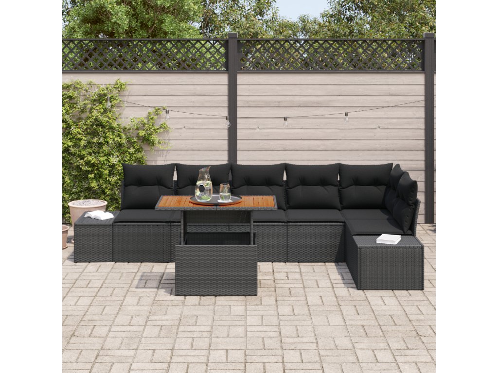 Vysoce kvalitní materiály: Kombinovaný poly ratan pro jeho UV-odolnost a práškově lakovaná ocel pro robustnost, tento zahradní set zajišťuje dlouhověkost a krásu i v drsném počasí. Povrch z masivního akáciového dřeva poskytuje teplý dotek, elegantně kontrastující s ostatními materiály a nabízí lesklý povrch. Pohodlné komponenty: Každý kus v sadě, od středových po rohové sedačky, má integrované úložné funkce, což vám umožňuje snadno schovat polštáře a venkovní potřeby. Opěrky a opěrky rukou jsou tkané z pohodlného poly ratanu, podporující uvolněný postoj. Univerzální funkce: Vybavené nastavitelnými nohami, tento set se citlivě přizpůsobuje nerovným povrchům. Modulární design vám umožňuje kreativně uspořádat sezení podle vašich představ, což ho činí přizpůsobivým pro různé příležitosti, ať už jde o intimní shromáždění nebo větší venkovní hostiny. Praktické použití: Perfektně padnoucí pro zahradní a terasové prostředí, tento stylový set je vhodný pro ty, kteří hledají klidné chvíle na slunci nebo chtějí uspořádat nezapomenutelné letní večírky. Jeho flexibilní design se bezproblémově hodí do jeho okolí, zlepšující jak velké terasy, tak kompaktní balkony. Snadná údržba: Aby si zachoval svůj prvotřídní vzhled, doporučuje se používat ochranný kryt, když se nepoužívá, aby ho chránil před živly. Odnímatelné polštáře se zipem usnadňují úklid, což zaručuje, že váš zahradní set zůstane středobodem pro relaxaci a zábavu po celé sezóny.- Barva: Černá a hnědá