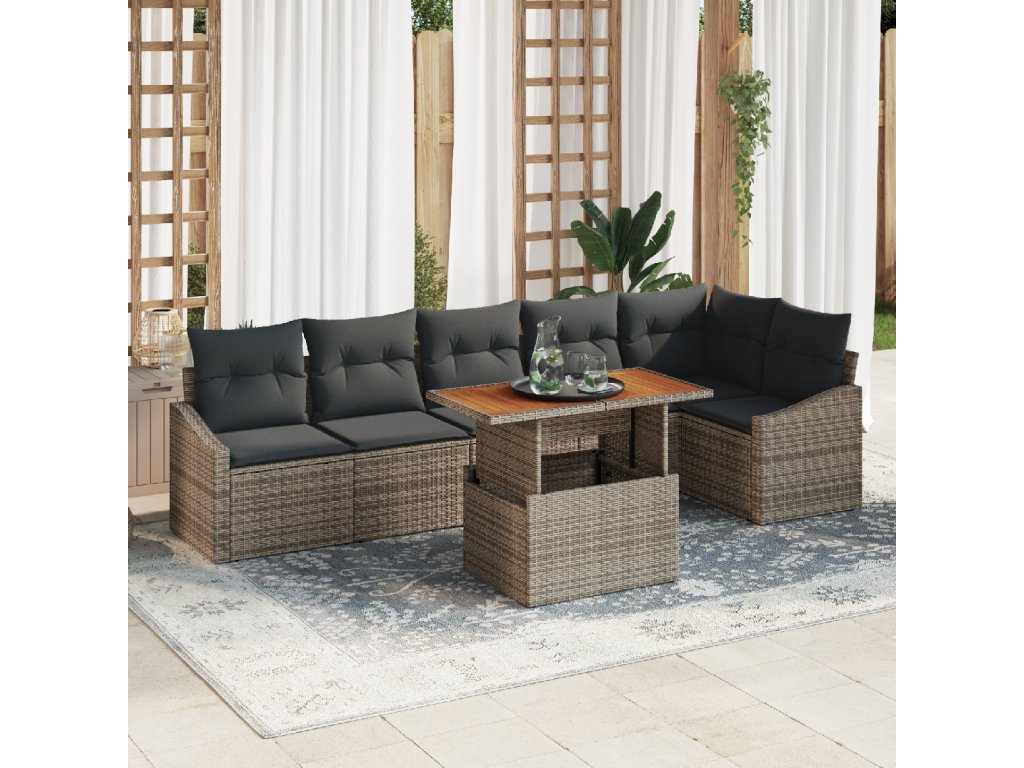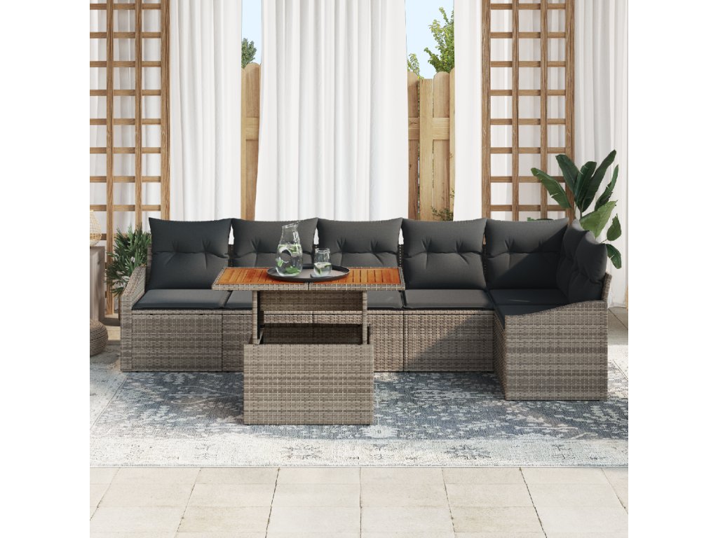 Složení Materiálu: Jídelní souprava je z durabilního poly ratanového pletení, které drží silný ocelový rám, takže zaručuje odolnost i styl. Tento poly ratan je perfektní pro venkovní použití, protože zvládne nepřízeň počasí. Ocelový rám se nebojí rzi, takže bude vypadat skvěle dlouho. Integrované Komponenty: Tato souprava má multifunkční sedadla se skrytým úložištěm, což je opravdu super praktické. Pohodlné křesla mají hranaté opěrky rukou pro příjemné sezení, plus potahy na polštáře se lehce sundávají pro úklid. Každý kus je navržen pro pohodlí a funkčnost. Stylový Design: Díky modulárnímu uspořádání a nastavitelným nohám si můžete soupravu přizpůsobit podle svého vkusu. Moderní vzhled se skvěle doplňuje s matným povrchem, který ji činí ještě lákavější a dodává vašemu venkovnímu dekoru šmrnc, a zároveň je to praktické. Funkční Použití: Tato jídelní souprava je perfektní na jaro a léto, splní všechny vaše potřeby pro venkovní zábavu. Nejde jen o vzhled; UV ochrana ji udrží středobodem vaší zahrady po léta. Povrch z akáciového dřeva dodává elegantní nádech. Jednoduchá Údržba: O tuto soupravu se snadno stará. Stačí ji zakrýt, když ji nepoužíváte, a užít si lehce čistitelné odnímatelné sedáky. Pravidelná péče udrží její vzhled svěží, takže splňuje správné standardy jak pro styl, tak pro funkčnost.- Barva: Šedá a hnědá