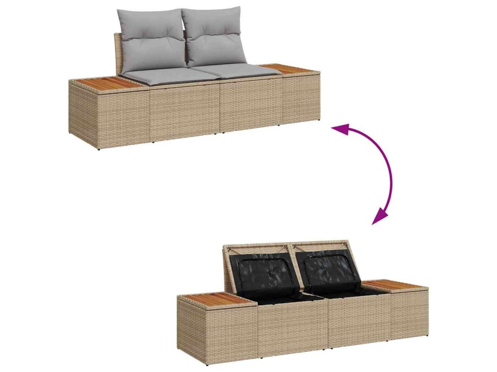 - Součásti: Souprava má skvělé funkce jako voděodolný úložný prostor integrovaný přímo do sedací a stolové plochy, což ji činí praktickou a šetrnou k prostoru. Je navržena pro pohodlí, s měkkými venkovními polštáři, které skvěle doplňují odolný poly ratan a ocel.
