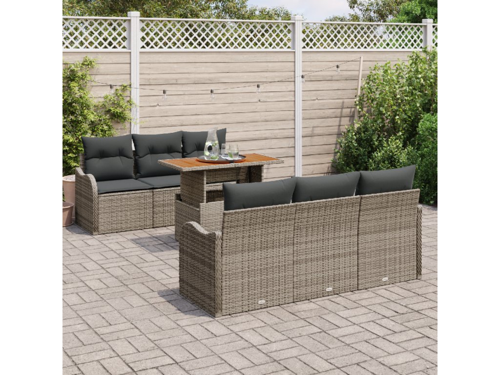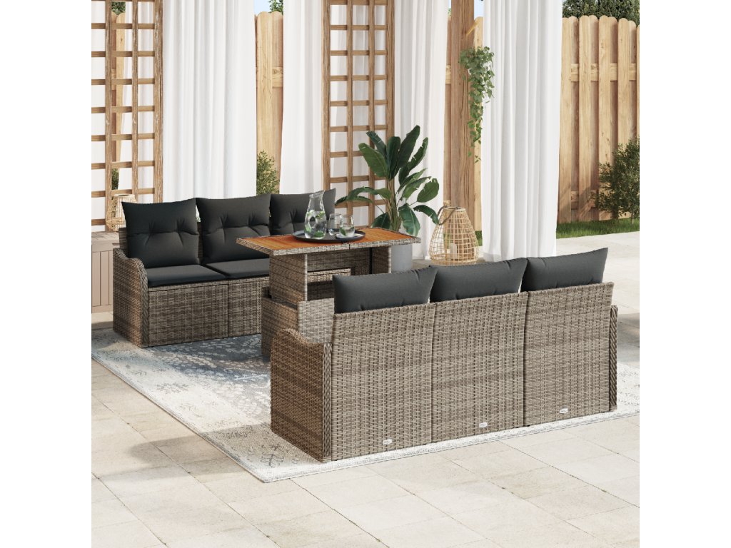 Materiály: Set využívá poly ratan a masivní akáciové dřevo, které jsou vybrány pro svou odolnost vůči povětrnostním vlivům a hezký vzhled. Poly ratan je hladký a odolný vůči UV záření, zatímco akáciové dřevo přidává přírodní kouzlo. Tyto materiály jsou perfektní pro odolný zahradní nábytek. Součásti: Set se skládá ze čtyř opěrákových pohovek, dvou středových sedadel a jednoho univerzálního zahradního stolu. Každá pohovka má zakřivenou opěrku a stylový design zaměřený na komfort. Odnímatelné polštáře na opěradlech a sedadlech jsou lehce čistitelné, což usnadňuje údržbu a prodlužuje jejich životnost. Funkce / Účel / Design: Klíčové prvky zahrnují ocelový rám s práškovým nástřikem pro odolnost a stůl v kontrastní barvě. Modulární design přizpůsobuje uspořádání sezení různým venkovním prostorům. Výškově nastavitelný stůl umožňuje přechod od neformálních ke formálnějším příležitostem. Doporučené použití: Tento set je ideální na zahradní akce, opalování nebo posezení s přáteli na terasách. Ergonomický design zajišťuje pohodlí a přizpůsobivost i v různých ročních obdobích. Péče a údržba: Pro delší životnost používajte kryt, když se nábytek nepoužívá. Polštáře snadno sundáte a vyčistíte, zatímco povrchy se jednoduše utírají, což udržuje jejich krásu.- Barva: Šedá