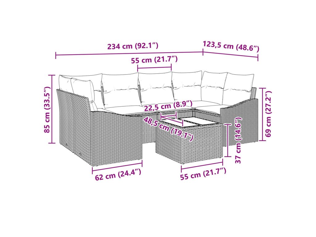 Tato zahradní pohovka je stylová a multifunkční, perfektní pro venkovní odpočinek a zábavu. S moderním designem a čistými liniemi perfektně zapadne do jakékoli zahrady nebo terasy. Modulární konfigurace vám dovolí přeskupit kusy podle potřeby, což se hodí, ať už hostíte přátele nebo si jen užíváte klidné odpoledne. Vzhled setu je sofistikovaný a zároveň praktický, takže se skvěle hodí do vašeho venkovního života.