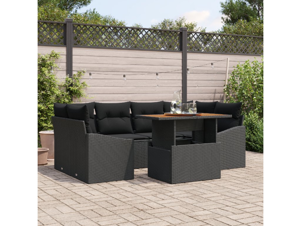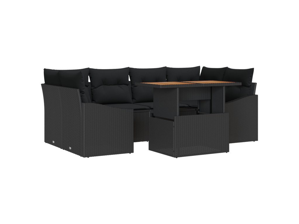 Materiály: Sestává z vysoce kvalitního polyratanu a masivního akáciového dřeva, tento jídelní set je navržen pro použití odolné vůči počasí. Materiál polyratan je mistrně tkaný, aby poskytoval stylový a moderní vzhled a zároveň podporoval odolnost proti ostrému slunečnímu záření. Doplněním designu, masivní akáciové dřevo přidává přirozený a organický pocit, harmonicky se slučující se svým okolím. Praktické komponenty: Tento set zahrnuje dvě pohovky s opěrkami, dvě rohová sedadla, dvě středová sedadla a jeden zahradní stůl, každý s integrovanými úložnými funkcemi. Navržené pro venkovní pohodlí, kusy nábytku poskytují prostorné oddíly pro udržení nezbytností organizovaných a skrytých, čímž udržují uklizený a funkční venkovní prostor. Strukturální prvky: Vybaven modulárním designem, tento set umožňuje snadnou rekonfiguraci uspořádání sezení. Nastavitelné nohy přidávají další funkčnost, zajišťují stabilitu na nerovných površích, zvyšují pohodlí a použitelnost. Každý kus má rámování s práškovým lakováním pro snadnou údržbu. Všestrané aplikace: Ideální pro zahrady a terasy, tento jídelní set může sloužit pro různé aktivity, od pořádání venkovních večeří po poskytování relaxačního prostoru pro rodinu a přátele. Jeho flexibilní design se bez námahy přizpůsobí různým uspořádáním zahrady a životnímu stylu. Péče o nábytek: Aby udržel svůj prvotřídní stav, používejte kryt na nábytek, když se nepoužívá. Další péče zahrnuje otírání povrchů suchým hadříkem a vyhnout se přímé vlhkosti. Přijetím těchto opatření zajistíte, že set zůstane funkční a vizuálně atraktivní po celé roky.- Barva: Černá a hnědá