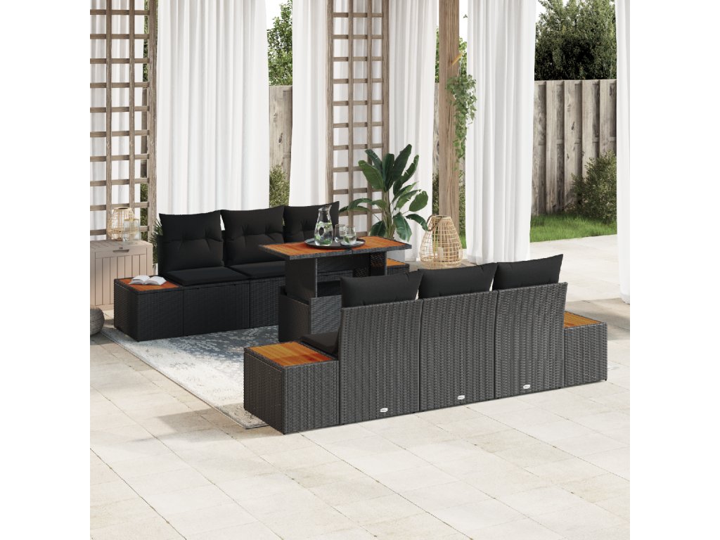 Materiály: Vyrobený z kvalitního poly ratanu, tento set vydrží různé počasí a má elegantní, moderní vzhled. Pevný ocelový rám, potažený práškovou barvou, brání rzi, zatímco akáciové dřevěné povrchy dodávají stylový prvek, kombinující trvanlivost s estetikou. Součásti: Set obsahuje čtyři boční pohovky a dvě středové sedáky, všechny s úložnými prostorem, plus prostorný zahradní stůl pro venkovní stolování. Odnímatelné sedáky se zipy usnadňují údržbu a zajišťují pohodlí. Funkce / Design: Modulární uspořádání znamená, že si můžete uspořádat sedačky podle sebe, ať už jde o velkou oslavu nebo malou rodinnou schůzku. Nastavitelné nohy zajišťují stabilitu na nerovném terénu, což zvyšuje pohodlí vašich venkovních zážitků. Doporučené použití: Ideální na jaro a léto, tenhle set je skvělý na lenošení u bazénu, večery pod světly na terase, nebo přátelské obědy na patiu. Perfektně se hodí do různých prostředí. Údržba: Aby byl set v top stavu, zakrývejte ho, když ho nepoužíváte, pro ochranu před deštěm a sluncem. Pravidelně ho utírejte měkkým, suchým hadříkem, aby dlouho vypadal skvěle.- Barva: Černá a hnědá