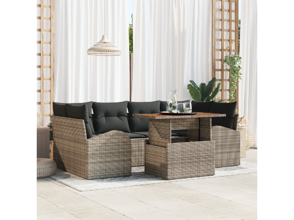 Odolné materiály: Elegantní mix poly ratanu a masivního akáciového dřeva vytváří skvělý vzhled, který zvládne všechna počasí. Ocel s práškovým lakováním zajišťuje stabilitu a zaručuje, že si užijete spoustu zábavy v sezóně. Kompletní součásti: Tento set obsahuje zahradní stůl, 2 opěrné sedačky, 2 rohové sedačky a 2 středové sedačky, všechny s praktickými úložnými možnostmi. Jemně zakřivené opěrky rukou poskytují skvělou podporu a ještě víc posilují moderní styl. Skvělé vlastnosti: Užívejte si výhody UV-odolných materiálů, které odolávají slunce. Odnímatelné polštáře usnadňují rychlé a snadné čištění, což dává tomuhle setu ještě větší praktičnost. Univerzální použití: Ideální pro venkovní místa, jako jsou zahrady a terasy na jaře a v létě, přetváří jakýkoli prostor na příjemné místo vašeho domova. Snadná údržba: Stačí zakrýt, když se nepoužívá, a otřít vlhkým hadříkem pro snadnou údržbu. Tyhle jednoduché kroky pomohou udržet tenhle set v top stavu rok suitable for co rok.- Barva: Šedá