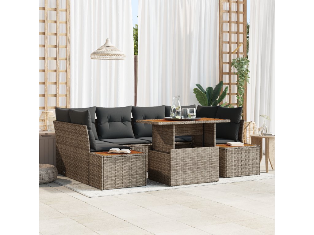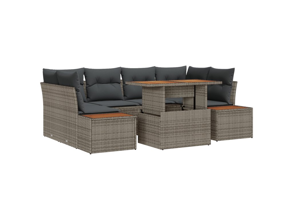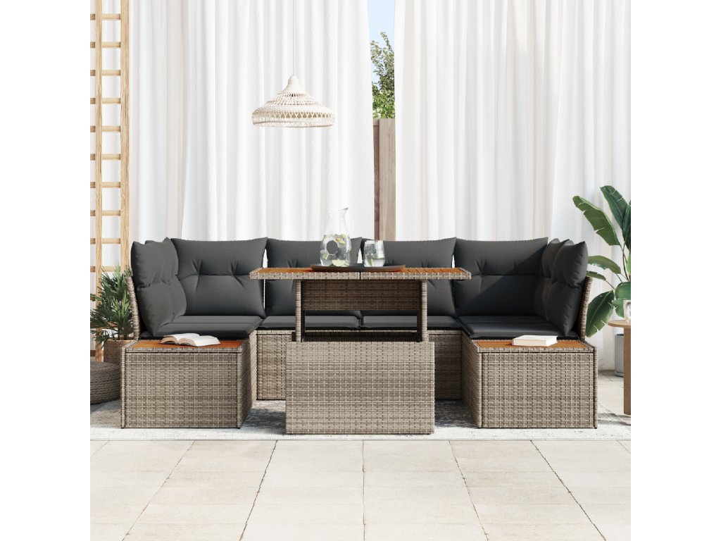 Modulární uspořádání: Tato sada obsahuje všestranné kousky, které lze přizpůsobit tak, aby vyhovovaly vašemu prostoru, což umožňuje optimální uspořádání sezení. Přizpůsobivost je ideální pro měnící se potřeby, takže máte flexibilitu při zábavě nebo neformálních rodinných jídlech. Materiály odolné vůči UV záření: Hlavním materiálem je poly ratan, navržený tak, aby odolával intenzivnímu slunečnímu záření a zachoval si barvu a integritu během sezón. To snižuje nároky na údržbu a poskytuje živou estetiku po celý rok. Pevný akáciový povrch: Povrch stolu se může pochlubit pevným dřevěným materiálem z akácie, známým svou robustností a přirozenou krásou. Tento povrch je ideální pro jídla a setkání, dodává vašemu venkovnímu prostoru nádech luxusu. Funkční úložný prostor: Úložné prostory pod sedadly jídelní sady umožňují snadnou organizaci a udržují potřebnosti blízko, uvolňují prostor pro bezproblémové prostředí. Perfektní pro polštáře nebo jídelní doplňky. Elegantní povrch: Práškově lakovaný ocelový rám je dokončen matným vzhledem, což zvyšuje trvanlivost. Tento nereflexní, hladký povrch podtrhuje moderní design sady, činí ji stylovou a odolnou vůči opotřebení.- Barva: Šedá a hnědá