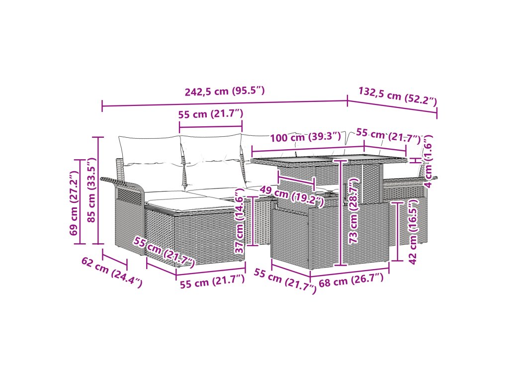 Prémiové materiály: S poly ratanovou konstrukcí vypadá tento set moderně, což spojuje venkovní eleganci s odolností. Povrch z masivního akáciového dřeva dodává přírodní nádech a trvalou krásu. Materiály zajišťují dlouhý výkon i v různých podmínkách. Součásti setu: Set obsahuje dvě arm sofas, jedno rohové sedadlo, dvě středová sedadla, podnožku a zahradní stůl. Modulární design zjednodušuje přeorganizování pro osobní i společenské potřeby, takže si každý užije pohodlí a praktické využití prostoru. Univerzální vlastnosti: Výškově nastavitelný stůl se přizpůsobí mezi kávovým stolkem a jídelním stolem, což je super pro různé akce. Odolná konstrukce zaručuje bezstarostné používání a materiály s UV ochranou si drží barvy i za slunce. Adaptivní design: Určeno pro venkovní použití v zahradách i na terasách, skvěle podporuje relaxaci v jarním a letním období. Minimalistický styl se hodí do různých venkovních kontextů a umožňuje jak malé, tak velké setkání. Ideální pro domy a pohostinské prostory, dává prostor příjemné útočiště. Pokyny pro údržbu: Abyste si zajistili dlouhou životnost, zakryjte nábytek, když ho nepoužíváte. Sestavení budou potřebovat dvě osoby a šroubovák. Udržujte set v původním stavu podle těchto pokynů a užívejte si jeho kvalitu po dlouhou dobu.- Barva: Šedá