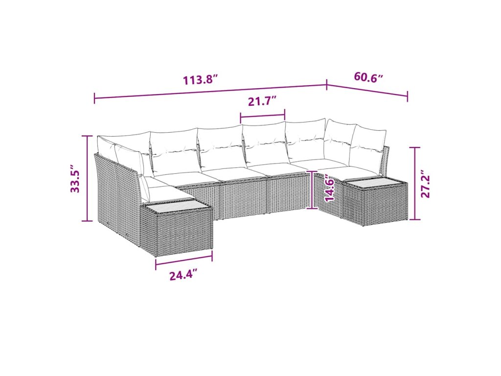 - Součásti – Pohovka má pevné plastové nohy a práškově lakovaný ocelový rám. Polyratanová opěradla a odnímatelné polštáře se zipy to spojují styl a jednoduché používání. Tyto funkce zvyšují pohodlí a dělají prostor příjemný pro relaxaci nebo zábavu.