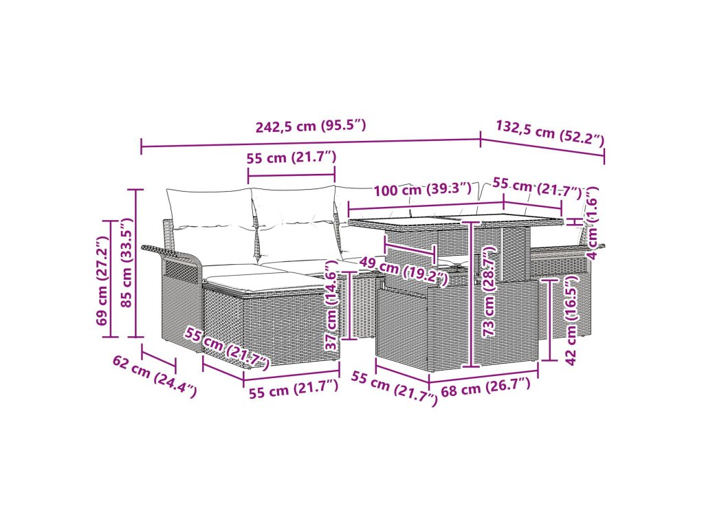 Tento zahradní pohovkový set, navržený s moderním nádechem, snadno zkrášlí jakýkoliv venkovní prostor. S obdélníkovým tvarem a tkanou texturou je skvělým místem pro setkání. Ubytuje až 7 lidí a vytváří perfektní prostory pro neformální akce i elegantní večeře, bez námahy spojuje komfort a styl.
