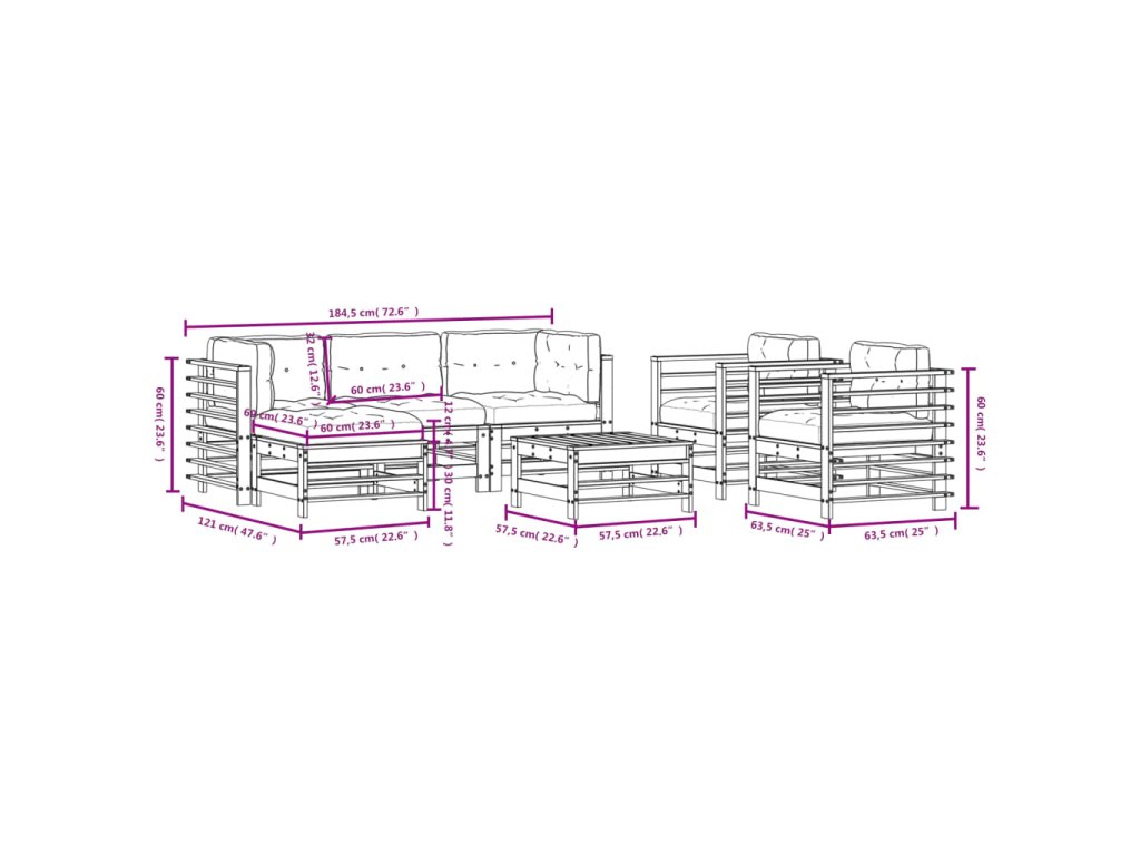 - Rozměry středové pohovky: 57,5 x 63,5 x 60 cm (D x Š x V)