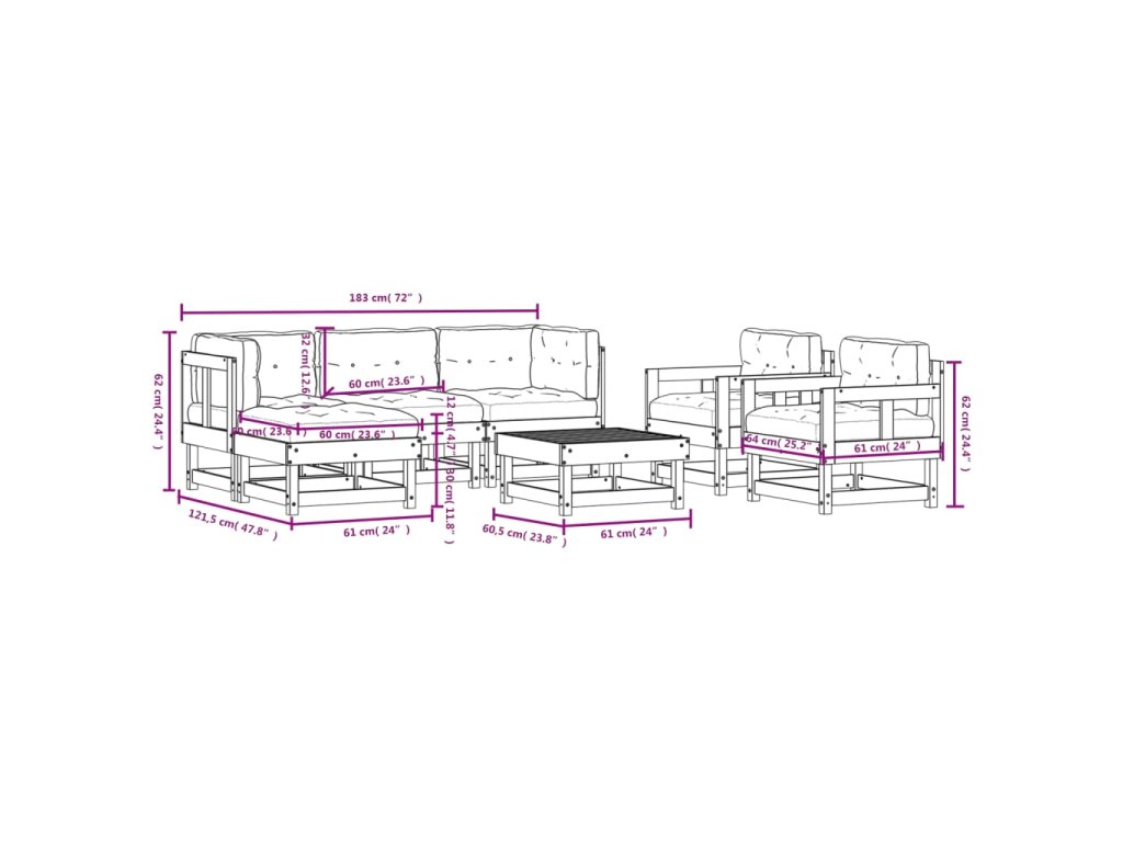 - Rozměry středové pohovky: 61 x 60,5 x 62 cm (D x Š x V)