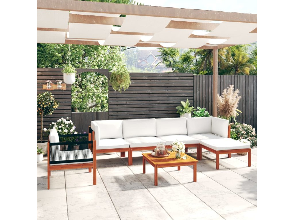 7dílná zahradní sedací souprava s polštáři krémové dřevo akácie a provaz