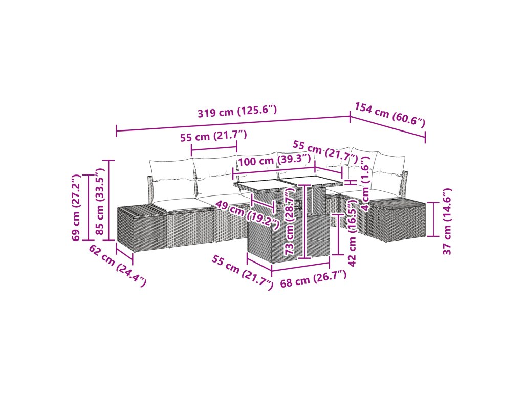 Materiály: S poly ratanem, tato pohovková souprava spojuje odolnost a moderní vzhled, což z ní dělá ideální volbu pro různá venkovní počasí. Rám z práškově lakované oceli dodává stabilitu, zatímco tvrzená skleněná deska stolu vypadá elegantně. Součásti: Souprava obsahuje dvě boční pohovky, jedno rohové sedadlo, tři středová sedadla a stolek. Každý prvek je udělaný s ohledem na pohodlí a dlouhou životnost. Vlastnosti / funkce / design: Hlavní předností je vysoký stůl, který se snadno přizpůsobí od kávy po jídlo. Modulární design umožňuje experimentovat s různými uspořádáními. Doporučené použití: Perfektní na zahrady a terasy, kde spojuje styl a funkčnost, a poskytuje prostor pro rodinné akce. Údržba: Použij ochranný kryt, když ji zrovna nepoužíváš. Sestavení vyžaduje sice dva lidi a šroubovák, ale dlouho ti vydrží, když se o ni správně postaráš.- Barva: Černá a krémová
