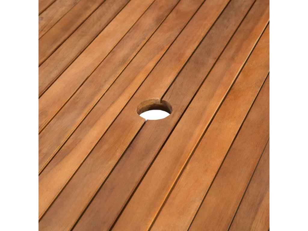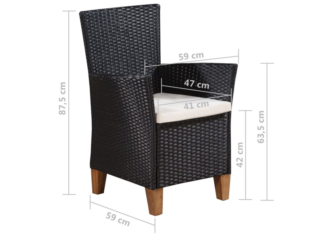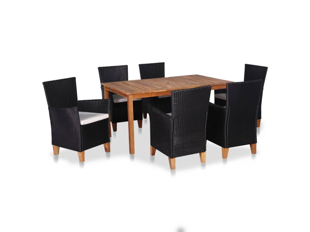 Zahradní stůl je vyroben z masivního akáciového dřeva s olejovaným povrchem, a je tudíž pevný a odolný. Má nadčasový design a vyzařuje rustikální kouzlo. Díky voděodolnému PE ratanu jsou křesílka odolná a nenáročná na údržbu. Ocelové rámy a nohy z masivního akáciového dřeva zajišťují, že jsou zahradní židle pevné a stabilní. Spolu s jídelními židlemi jsou dodávány i pohodlné podušky. Potahy podušek z polyesterové tkaniny jsou nenáročné na údržbu a v případě potřeby je možné je sejmout a vyprat.