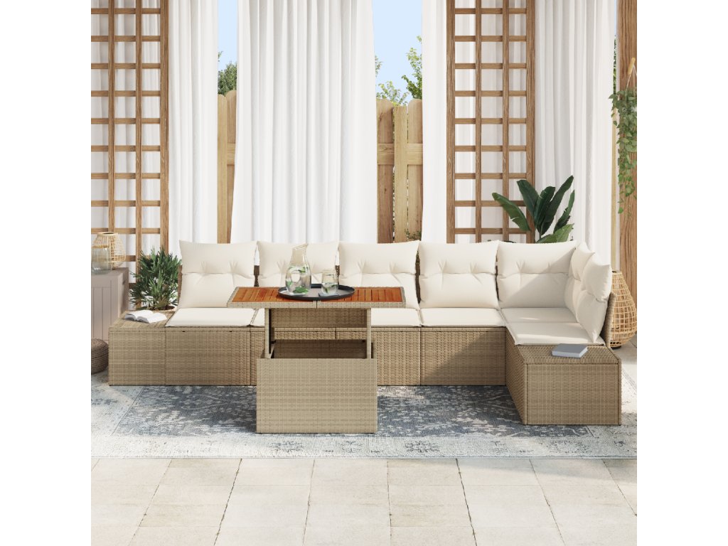 Vysoce kvalitní materiály: Kombinovaný poly ratan pro jeho UV-odolnost a práškově lakovaná ocel pro robustnost, tento zahradní set zajišťuje dlouhověkost a krásu i v drsném počasí. Povrch z masivního akáciového dřeva poskytuje teplý dotek, elegantně kontrastující s ostatními materiály a nabízí lesklý povrch. Pohodlné komponenty: Každý kus v sadě, od středových po rohové sedačky, má integrované úložné funkce, což vám umožňuje snadno schovat polštáře a venkovní potřeby. Opěrky a opěrky rukou jsou tkané z pohodlného poly ratanu, podporující uvolněný postoj. Univerzální funkce: Vybavené nastavitelnými nohami, tento set se citlivě přizpůsobuje nerovným povrchům. Modulární design vám umožňuje kreativně uspořádat sezení podle vašich představ, což ho činí přizpůsobivým pro různé příležitosti, ať už jde o intimní shromáždění nebo větší venkovní hostiny. Praktické použití: Perfektně padnoucí pro zahradní a terasové prostředí, tento stylový set je vhodný pro ty, kteří hledají klidné chvíle na slunci nebo chtějí uspořádat nezapomenutelné letní večírky. Jeho flexibilní design se bezproblémově hodí do jeho okolí, zlepšující jak velké terasy, tak kompaktní balkony. Snadná údržba: Aby si zachoval svůj prvotřídní vzhled, doporučuje se používat ochranný kryt, když se nepoužívá, aby ho chránil před živly. Odnímatelné polštáře se zipem usnadňují úklid, což zaručuje, že váš zahradní set zůstane středobodem pro relaxaci a zábavu po celé sezóny.- Barva: Béžová a krémová