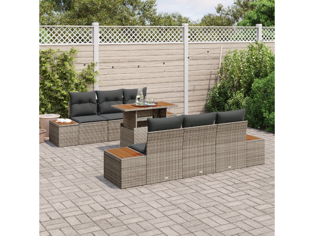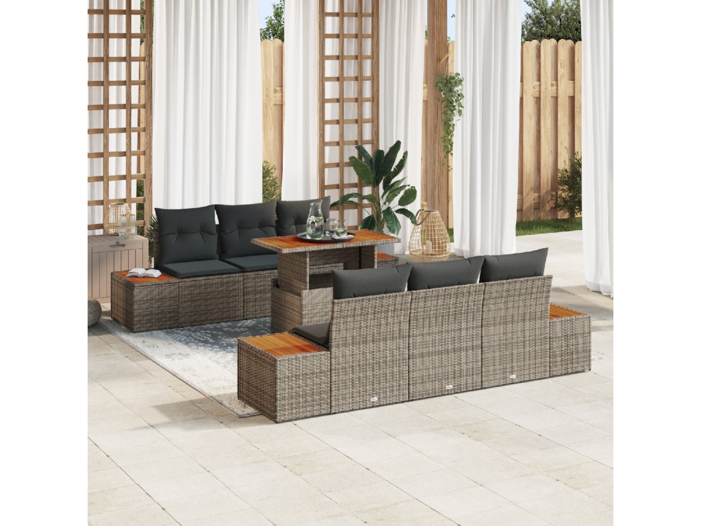 Materiály: Vyrobený z kvalitního poly ratanu, tento set vydrží různé počasí a má elegantní, moderní vzhled. Pevný ocelový rám, potažený práškovou barvou, brání rzi, zatímco akáciové dřevěné povrchy dodávají stylový prvek, kombinující trvanlivost s estetikou. Součásti: Set obsahuje čtyři boční pohovky a dvě středové sedáky, všechny s úložnými prostorem, plus prostorný zahradní stůl pro venkovní stolování. Odnímatelné sedáky se zipy usnadňují údržbu a zajišťují pohodlí. Funkce / Design: Modulární uspořádání znamená, že si můžete uspořádat sedačky podle sebe, ať už jde o velkou oslavu nebo malou rodinnou schůzku. Nastavitelné nohy zajišťují stabilitu na nerovném terénu, což zvyšuje pohodlí vašich venkovních zážitků. Doporučené použití: Ideální na jaro a léto, tenhle set je skvělý na lenošení u bazénu, večery pod světly na terase, nebo přátelské obědy na patiu. Perfektně se hodí do různých prostředí. Údržba: Aby byl set v top stavu, zakrývejte ho, když ho nepoužíváte, pro ochranu před deštěm a sluncem. Pravidelně ho utírejte měkkým, suchým hadříkem, aby dlouho vypadal skvěle.- Barva: Šedá a hnědá