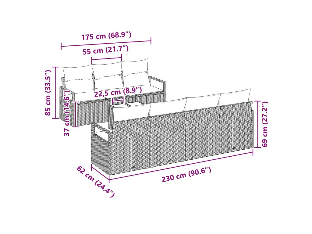 Odolný materiál: Prémiový poly ratan si skvěle poradí s náročnými podmínkami. Jeho textilní povrch přidává sofistikovanost. Funkčnost zajištěna: Plochá opěrka a ocelové nohy poskytují potřebnou stabilitu, takže se nábytek skvěle hodí do vašeho venkovního prostoru. Kompletní set: Obsahuje kombinace sedací části se třemi centrálními a čtyřmi bočními pohovkami a skleněný stůl pro snadné údržbu. Sezónní přizpůsobení: Vhodný na jaro a léto, díky UV ochraně si zachová vzhled po celou sezónu. Pokyny k údržbě: Používejte ochranné plachty, když se nábytek nepoužívá, tím udržíte vzhled a odolnost sady na dlouhou dobu.- Barva: Šedá