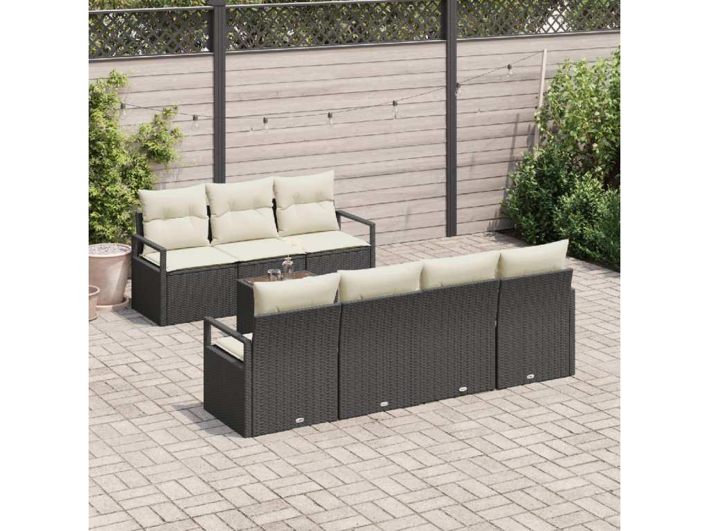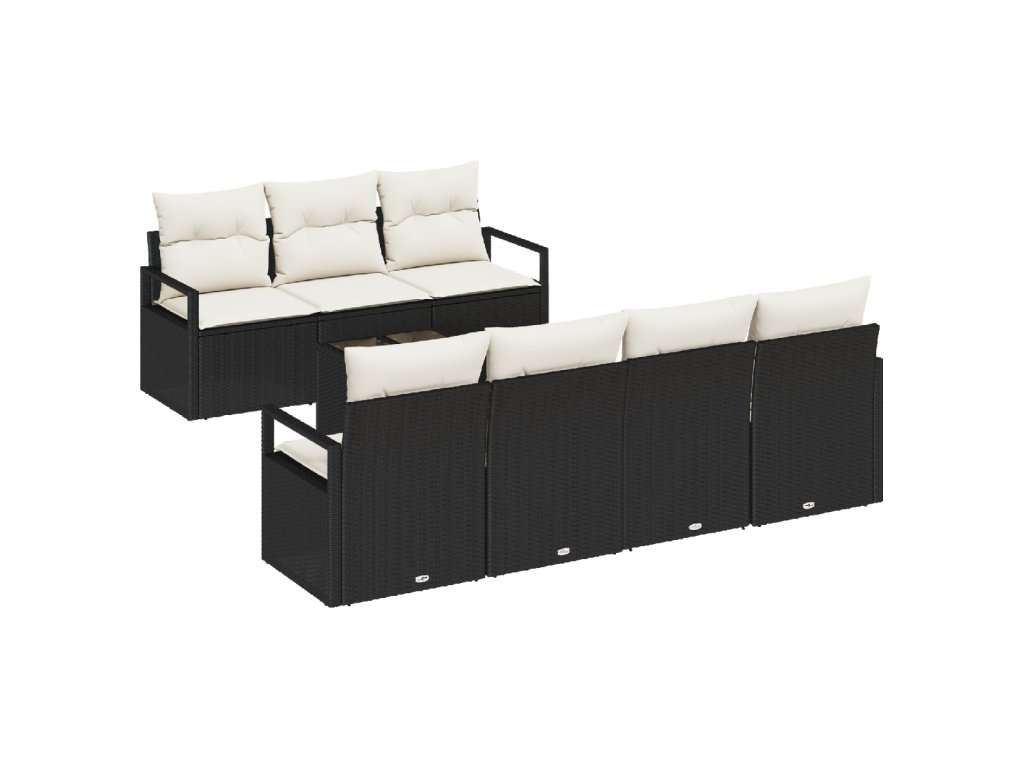 Odolný materiál: Prémiový poly ratan si skvěle poradí s náročnými podmínkami. Jeho textilní povrch přidává sofistikovanost. Funkčnost zajištěna: Plochá opěrka a ocelové nohy poskytují potřebnou stabilitu, takže se nábytek skvěle hodí do vašeho venkovního prostoru. Kompletní set: Obsahuje kombinace sedací části se třemi centrálními a čtyřmi bočními pohovkami a skleněný stůl pro snadné údržbu. Sezónní přizpůsobení: Vhodný na jaro a léto, díky UV ochraně si zachová vzhled po celou sezónu. Pokyny k údržbě: Používejte ochranné plachty, když se nábytek nepoužívá, tím udržíte vzhled a odolnost sady na dlouhou dobu.- Barva: Černá a krémová