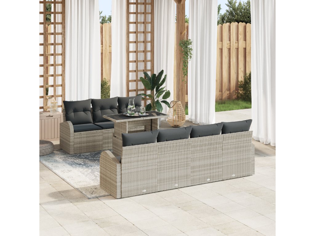 Odolné vůči počasí Tato patio souprava vyrobená z kvalitního poly ratanu odolává různým venkovním podmínkám. Je chráněná proti UV záření, takže si zachovává svý vzhled i po slunečných dnech, což ji dělá ideální pro jarní a letní použití. Její voděodolné vlastnosti zajišťují její dlouhověkost, i když je venku, takže ji budete moct užívat roky. Komplexní komponenty Souprava obsahuje tři centrální sedáky, čtyři pohovky a jeden stůl, všechno s pohodlnými venkovními polštáři. Každý kus má svou funkci a zajišťuje pohodlné sezení. Ocelový rám a poly ratan dodávají na robustnosti, zatímco temperované sklo je snadné na údržbu. Nastavitelné stolní plochy Stůl snadno změníte z odkládacího na jídelní, takže můžete upravit prostor podle potřeby. Tato ručně nastavitelná funkce vám umožní přizpůsobit si uspořádání na kávu nebo večeři, takže je skvělá pro různé příležitosti. Moderní styl Minimalistický design ladí s moderními outdoorovými prostory. Jeho decentní vzhled skvěle doplní jakýkoli dekor a zvýrazní krásu vaší zahrady. Snadná údržba Abyste udrželi soupravu v perfektním stavu, používejte kryt, když ji nepoužíváte. Pomůže to ochránit nábytek před prachem a deštěm, takže si zachováte její vzhled a funkčnost.- Barva: Světle šedá
