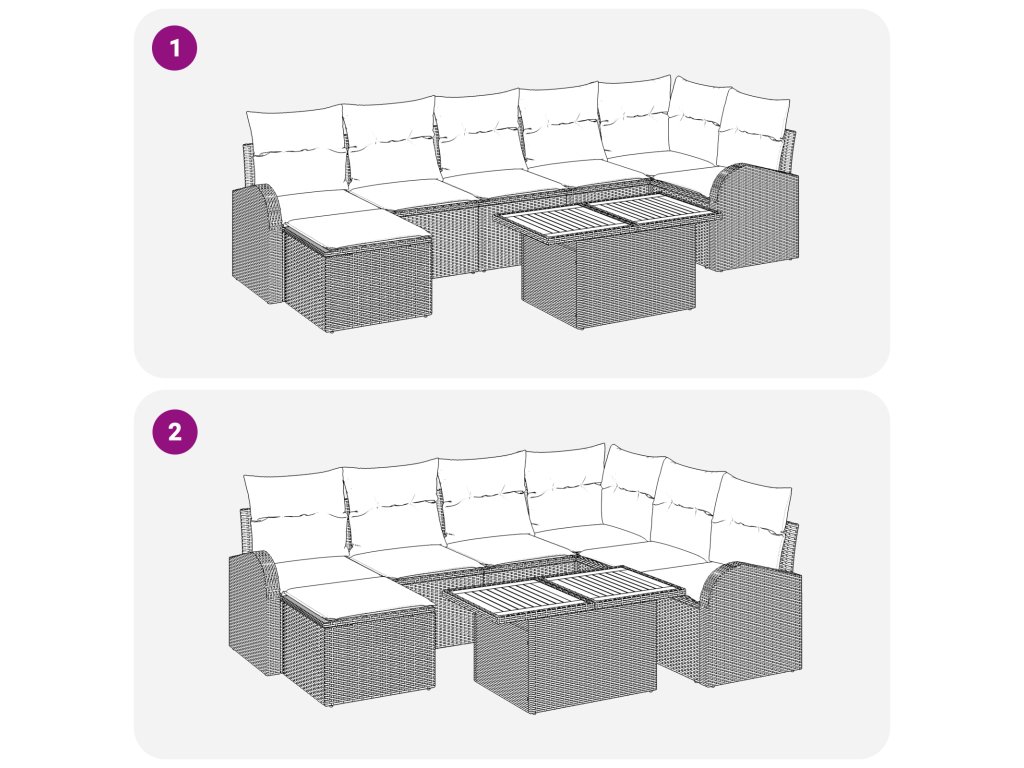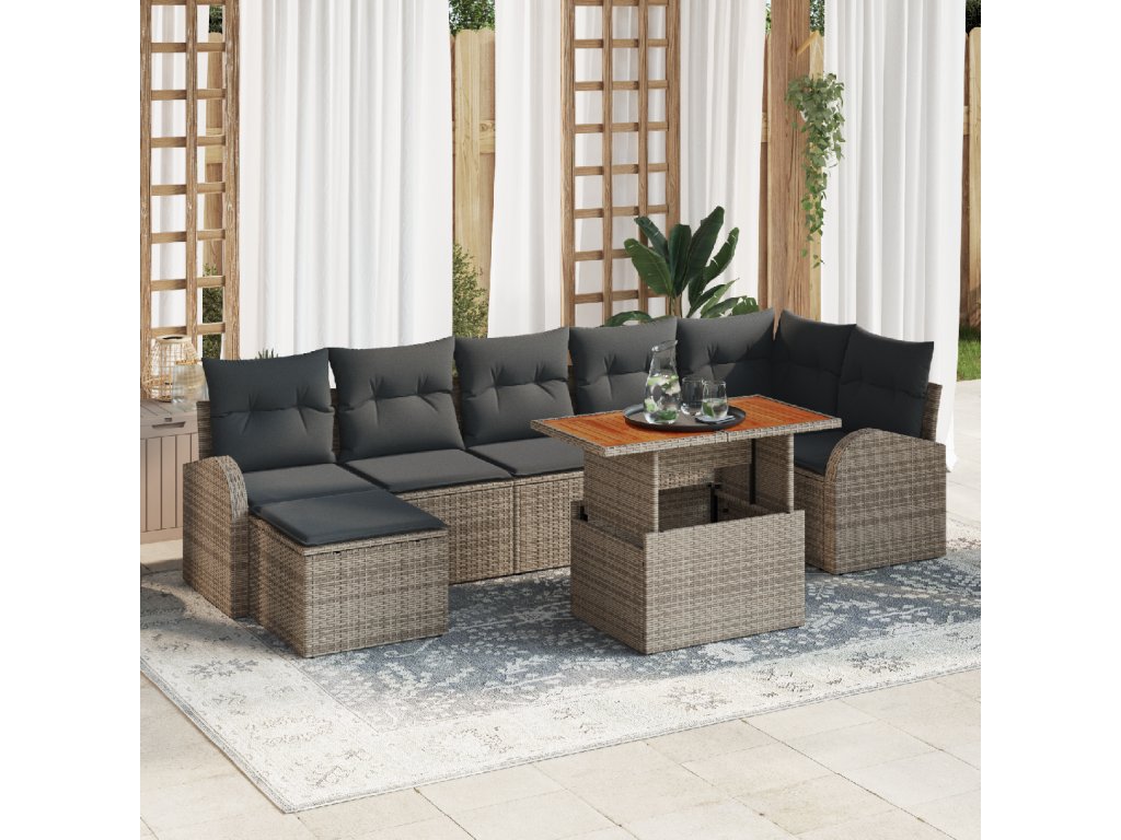 Ekologický polyratan: Set je vyroben z polyratanu s moderní tkanou strukturou. Je odolný vůči povětrnostním vlivům, zvlášť UV paprskům, takže tvůj venkovní nábytek vypadá pořád jako nový. A ještě je super lehký, takže se snadno přesouvá. Funkční sezení s úložným prostorem: Každé sedadlo, včetně křesel, rohového sedáku a taburetu, má skrytý úložný prostor. To znamená, že máš prostor na piknikové deky nebo grilovací nářadí a udržíš venkovní prostor tidy. Odolný akáciový stůl: Set má pevný stůl z akáciového dřeva, známého svou robustností a hezkou texturou. Nabízí spoustu prostoru na jídlo, nápoje nebo dekorace. Venkovní polštáře odolné vůči povětrnostním vlivům: Polštáře jsou určené na venek, snesou déšť i slunce a snadno se čistí, takže si užiješ pohodlí bez starostí. Snadná údržba a péče: Aby set vypadal báječně dlouho, stačí ho otřít vlhkým hadříkem a používat ochranné obaly, když ho nepoužíváš. A když se počasí zhorší, je lepší přenést polštáře dovnitř, aby se udržely v dobrém stavu.- Barva: Šedá
