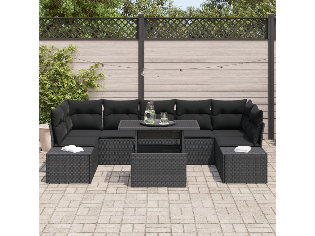 Kvalitní materiály: Konstrukce z polyratanu zajišťuje odolnost a běžnou údržbu, takže se hodí do venkovního prostředí. Pevná struktura odolává nepříznivému počasí, čímž si zachovává svoji krásu. Funkční komponenty: Rám z práškované oceli a stůl z tvrzeného skla. Sedací polštáře jsou vyplněny polyesterovými vlákny a mají odnímatelný kryt na zip pro pohodlí. Inovativní funkce: Výškově nastavitelný stůl se jednoduše přemění z kávového na jídelní stůl pomocí jednoduchého ručního ovládání. Lehká konstrukce usnadňuje přesouvání po zahradě nebo terase. Univerzální použití: Ideální pro zahrady a terasy, souprava pohovek se přizpůsobí všem formálním i neformálním akcím. Její přestavitelné sekce umožňují vytvoření uspořádání podle potřeby. Jednoduchá údržba: Použijte ochranný kryt, když se nepoužívá, aby se udržela v dobrém stavu. Povrchy se dají snadno otřít, což zajišťuje jednoduchou údržbu.- Barva: Černá