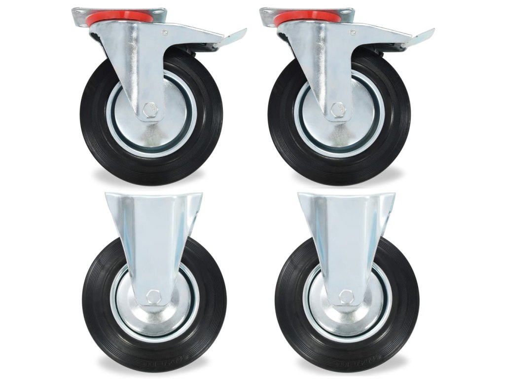 Kolečka jsou vyrobená z gumy, která je známá pro svou schopnost pohlcovat nárazy a vibrace. Ať už tedy kolečka namontujete na cokoliv, budete to moci přesouvat hladce a v tichosti. Jejich hladký povrch navíc ochrání vaši podlahu před poškrábáním. Zinkem potažený ocelový rám je odolný proti rzi, a tudíž kolečkům dodává na odolnosti a prodlužuje jejich životnost. Polovina těchto otočných koleček je vybavená dvojitou brzdou pro flexibilnější ovládání. Každé kolečko má maximální nosnost až 180 kg.