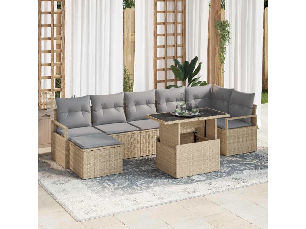 Odolné materiály Set je vyroben z kvalitního poly ratanu, který odolává UV záření a nepříznivému počasí. Práškově lakovaný ocelový rám zajišťuje stabilitu a dlouhou životnost. Tento materiál se postará o to, aby set vypadal stále jako nový. Součásti v balení Set obsahuje rohovou část, tři středová sedadla, dva taburety a stůl, což vše dohromady skvěle funguje. Součástí jsou také měkké polštáře, které zaručují pohodlí. Vše bylo pečlivě navrženo, aby ladilo s moderním stylem exteriéru. Funkčnost a design Modulární design vám dovolí snadno měnit uspořádání sedadel, což je skvělé na různé příležitosti. Dobře promyšlené úložné prostory vám pomohou udržet pořádek na vaší terase nebo v zahradě. Tato přizpůsobivost je ideální pro společenské akce. Univerzálnost aplikace Set skvěle zapadne do zahrad, teras nebo moderních městských balkonů. Hodí se jak na neformální setkání, tak k odpočinku, takže je všestranný pro různé venkovní prostředí. Snadná údržba Údržba je jednoduchá: stačí používat ochranné kryty a polštáře, když je nepoužíváte, uchováte tak set v dobrém stavu s minimálním úsilím.- Barva: Béžová a světle šedá