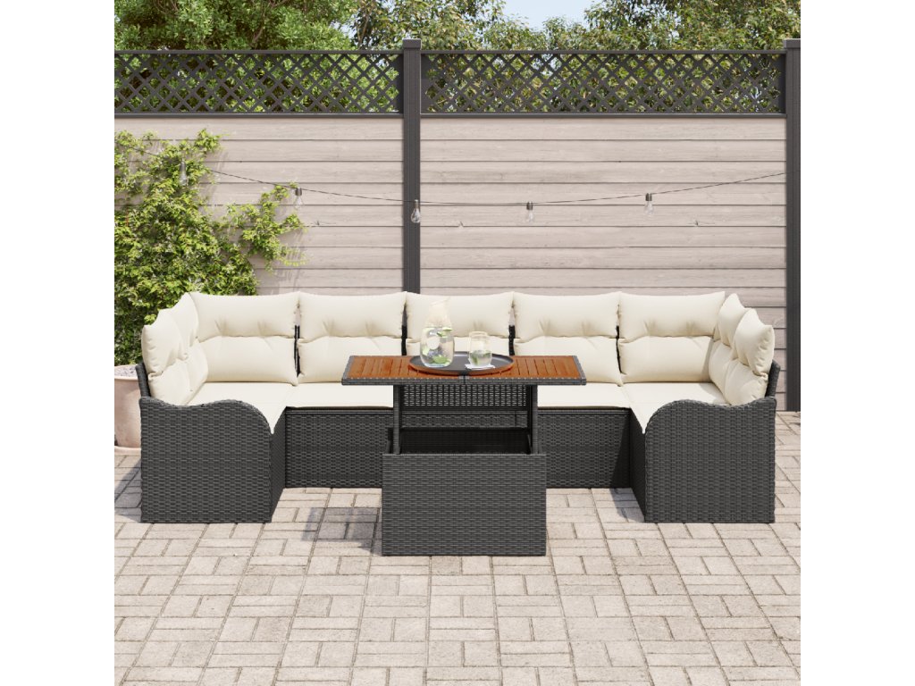 - Odolná konstrukce: Tento zahradní pohovkový set, vyrobený z poly ratanu a masivního akáciového dřeva, vypadá skvěle a má dlouhou životnost. Poly ratan je odolný proti UV záření, takže set si udrží svůj vzhled i v těžkých podmínkách, zatímco akáciové dřevo dodává stabilitu a šmrnc.