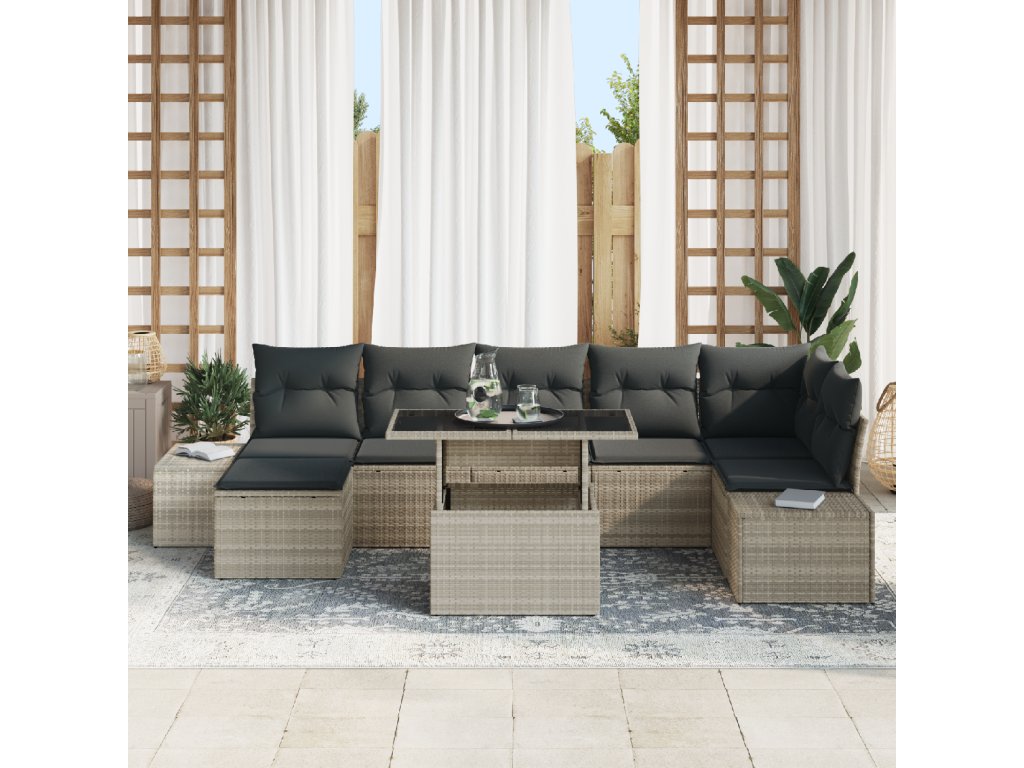Materiály: Sofa set je z odolného polyratanu, co zaručuje, že to zvládne venkovní podmínky. Tenhle materiál vydrží počasí, hlavně na jaře a v létě, takže je praktický i estetičtější. Polyratan je odolný proti oděru, což prodlužuje životnost a drží vzhled nábytku. Součásti: Set obsahuje rám z polyratanu, opěradlo a temperované sklo na stolu – to všechno přidává na vzhledu a pevnosti. Taky má pohodlné polštáře s polyesterovým výplní pro dlouhý komfort. Vlastnosti / Funkce / Design: Hlavní věc, co umí, je nastavitelná deska stolu, co se lehce změní z jídelního na kávový stůl. To ti umožní si to přizpůsobit, ať už chceš jíst s rodinou nebo mít koktejlovou sešlost. Tento modulární set se integruje do tvojeho venkovního prostoru bez problémů. Doporučené použití: Tenhle set je ideální do zahrad a na terasy, tak si můžeš užívat sezónní příležitosti. Vypadá dobře na neformální i formální akce, takže je univerzální pro různý příležitosti. Údržba: Péče o set je jednoduchá. Doporučuje se na něj používat kryty, když ho zrovna nepoužíváš, aby se to zachovalo v nejlepší kondici. To chrání textury a barvy polyratanu, a díky tomu ti set dlouho vydrží.- Barva: Světle šedá