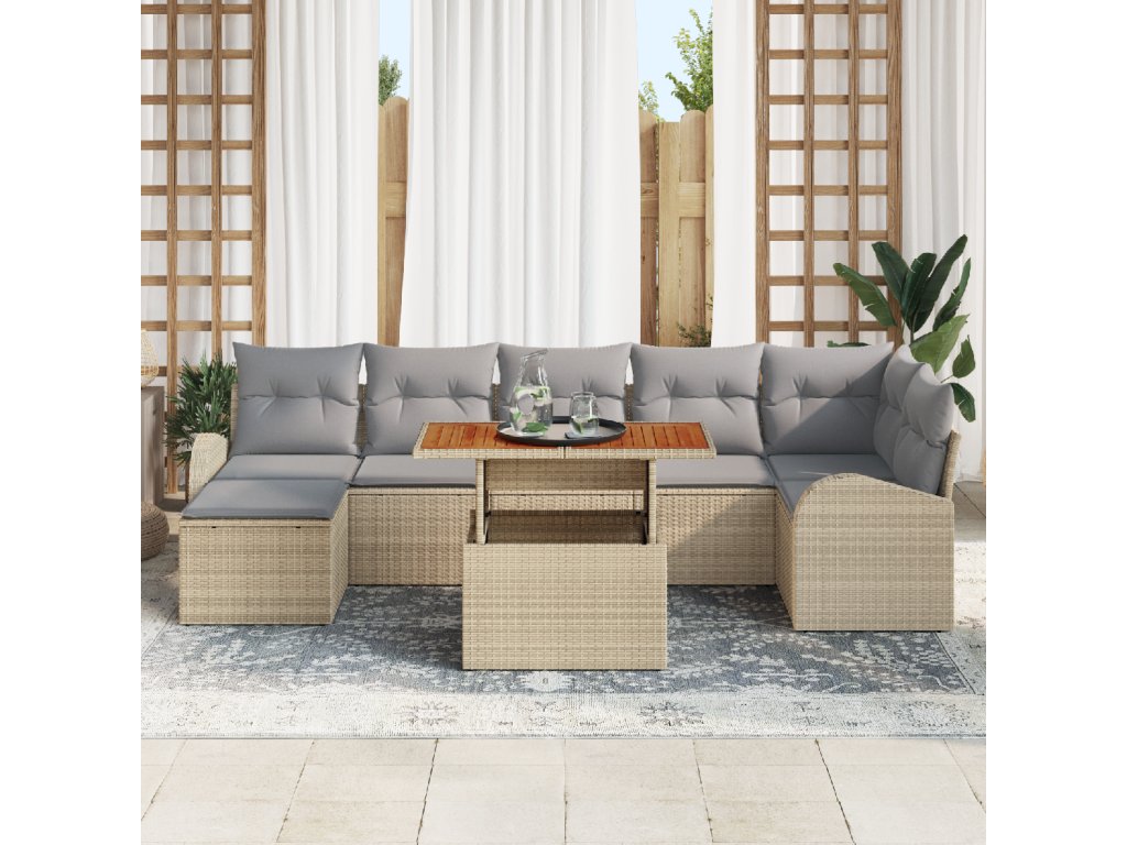 Ekologický polyratan: Set je vyroben z polyratanu s moderní tkanou strukturou. Je odolný vůči povětrnostním vlivům, zvlášť UV paprskům, takže tvůj venkovní nábytek vypadá pořád jako nový. A ještě je super lehký, takže se snadno přesouvá. Funkční sezení s úložným prostorem: Každé sedadlo, včetně křesel, rohového sedáku a taburetu, má skrytý úložný prostor. To znamená, že máš prostor na piknikové deky nebo grilovací nářadí a udržíš venkovní prostor tidy. Odolný akáciový stůl: Set má pevný stůl z akáciového dřeva, známého svou robustností a hezkou texturou. Nabízí spoustu prostoru na jídlo, nápoje nebo dekorace. Venkovní polštáře odolné vůči povětrnostním vlivům: Polštáře jsou určené na venek, snesou déšť i slunce a snadno se čistí, takže si užiješ pohodlí bez starostí. Snadná údržba a péče: Aby set vypadal báječně dlouho, stačí ho otřít vlhkým hadříkem a používat ochranné obaly, když ho nepoužíváš. A když se počasí zhorší, je lepší přenést polštáře dovnitř, aby se udržely v dobrém stavu.- Barva: Béžová a světle šedá