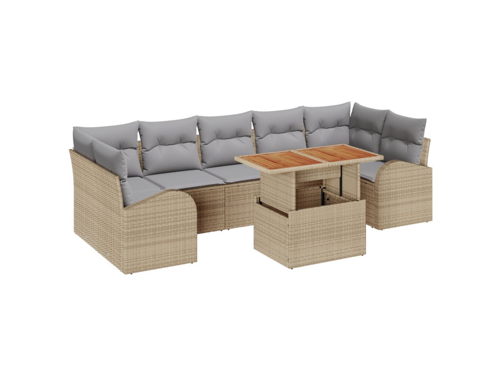 Materiály: Vyrobeno z odolného poly ratanu, tato zahradní souprava je navržena tak, aby vydržela venkovní počasí. Stůl z masivního akáciového dřeva dodává přírodní teplo a styl. Práškově lakovaná ocel udržuje rám stabilní a silný, takže má dlouhou životnost. Součásti: Souprava zahrnuje dvě křesla, dvě rohová sedadla, tři centrální sedadla a jeden zahradní stůl, vše s praktickým úložným prostorem. Tyto kusy se snadno spojí a vytvoří skvělou sedací soupravu pro zábavu a odpočinek s dostatkem místa. Stůl a sedadla k sobě skvěle padnou a vytvářejí krásný a soudržný vzhled. Funkce / Účel / Design: Tato souprava je vyrobena z UV-odolných materiálů, takže zvládne sluneční paprsky. Polštáře se snadno sundávají na čištění, takže jsou hodně praktické. Díky stylovému designu zůstává souprava vypadat skvěle v každém ročním období. Doporučené použití: Ideální pro zahrady, terasy a venkovní patia, tato jídelní souprava je skvělá na neformální jídla, socializaci nebo jen lenošení. Její chytrý tkaný design se skvěle hodí do jakéhokoliv venkovního prostředí a vytváří příjemný prostor pro rodinu a přátele. Údržba: Aby zůstala ve skvělé kondici, stačí ji otřít vlhkým hadříkem a zakrýt v době, kdy ji nepoužíváte. Tyto jednoduché kroky pomáhají zachovat její vzhled a funkčnost, takže můžete svou venkovní investici užívat dlouho.- Barva: Béžová a světle šedá